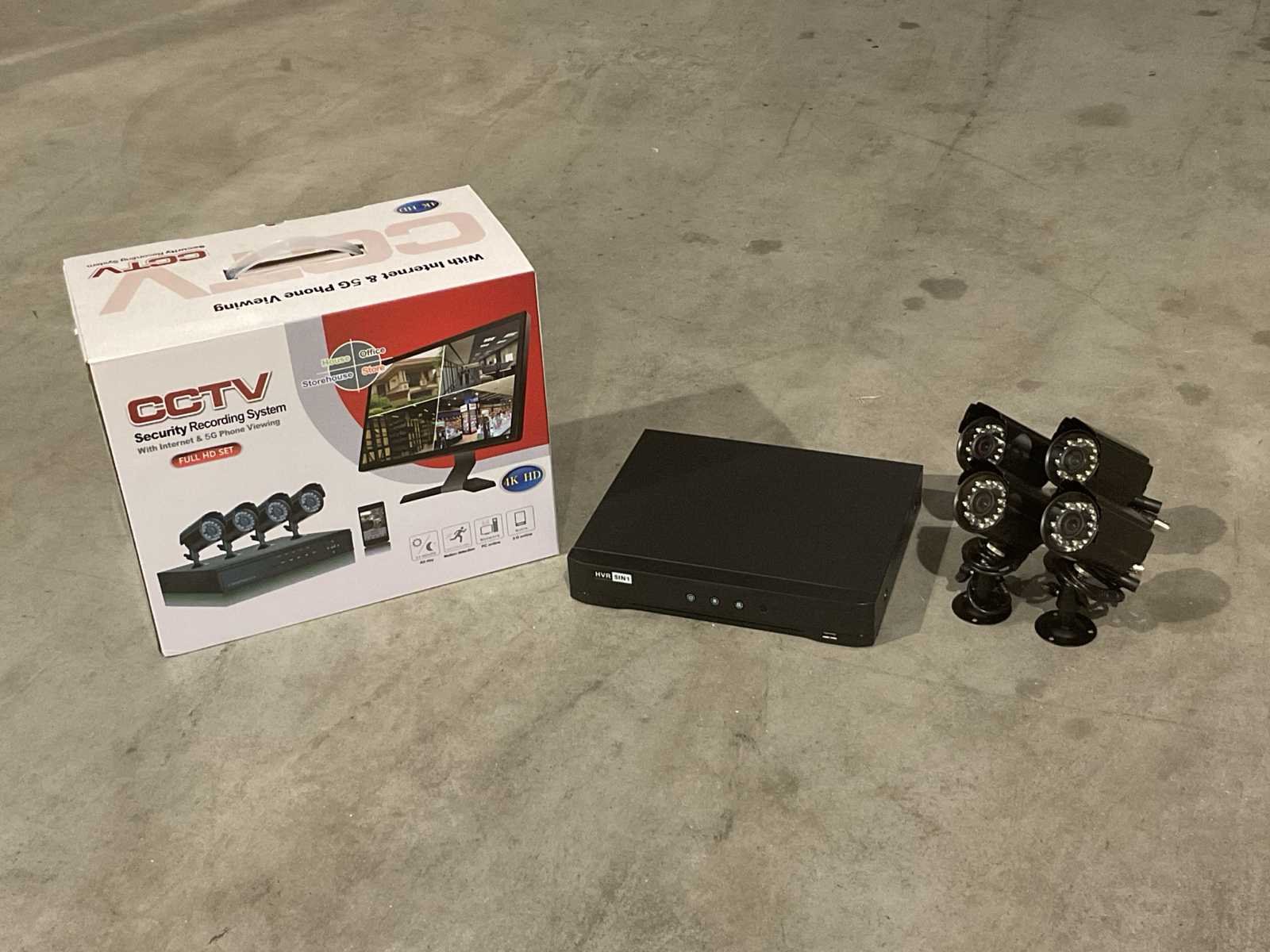 Voorzien van 4 camera’s; bewegingssensor; DVR; Resolutie VGA 1280X1024; 4 kabels 10mtr kabel; 2 x power adapter; 1 x muis; 2 x usb poorten; 1 x SATA harde schijf slot; netwerk aansluiting rj45; DC12V; video input: 4CH BNC; Video-output: 1x VGA, 1x CVBS, 1x HDMI; Audio input: 2 kanaal RCA; Audio output: 1ch RCA; 3.6 mm lens; kijkhoek: 60 graden; Nachtzicht: LED IR, 15M range; ongebruikt in doos Merk: CCTV Model: Security Recording system Product type: With internet & 5G phone viewing Kleur: Zwart Wifi: true Gewicht: 3kg Lengte: 34cm Breedte: 18cm Hoogte: 27cm