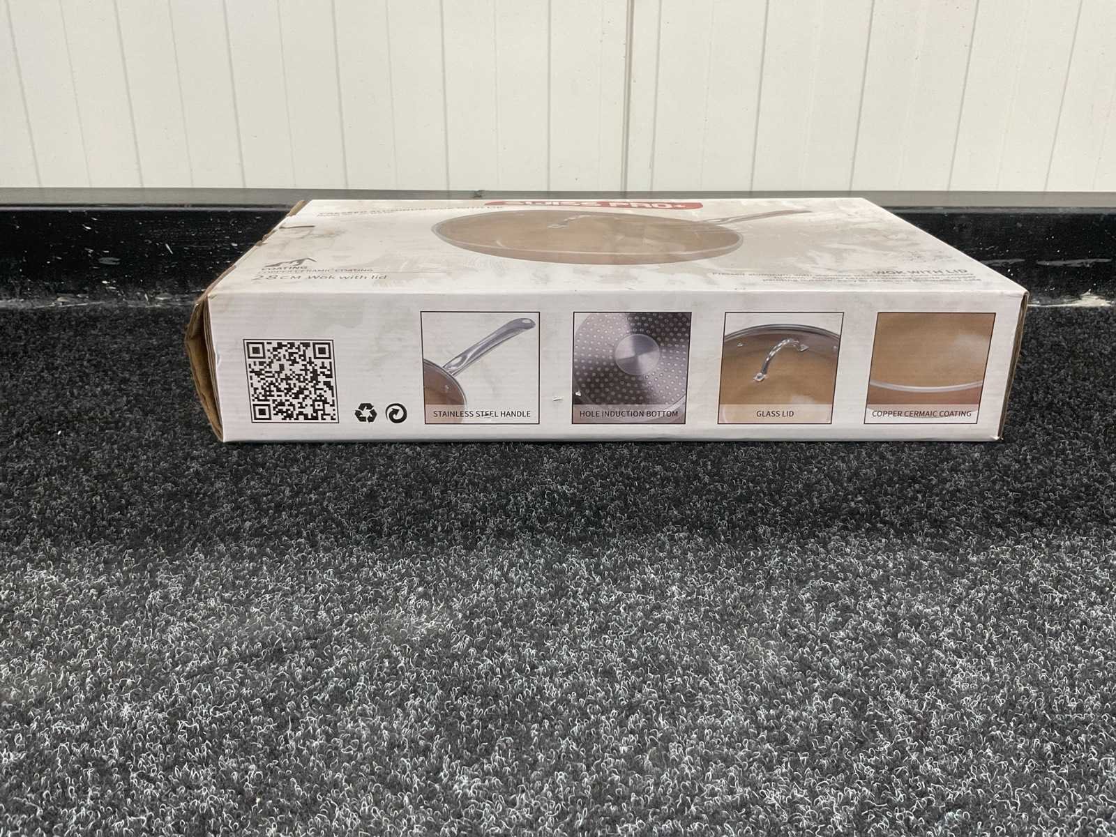 Voorzien van geperst aluminium en roestvrij staal; aluminium handgreep; gat inductie bodem; koperen keramische coating; PFOA-vrij; glazen deksel; antiaanbaklaag; ongebruikt in doos Merk: Swiss Pro + Model: SP-WK28C Product type: Wok Kleur: Copper Gewicht: 1800g Lengte: 50cm Breedte: 31cm Hoogte: 10cm