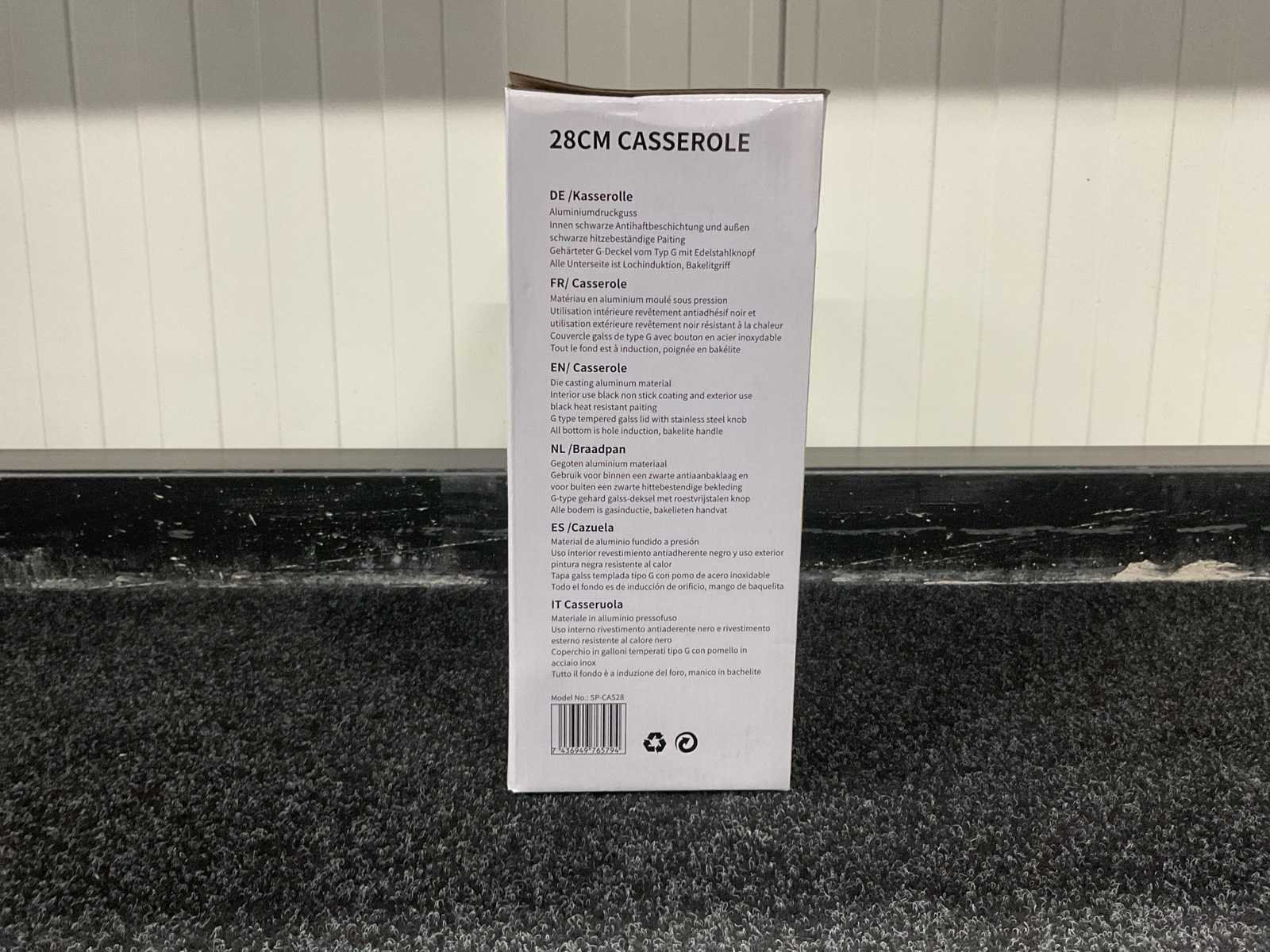 Voorzien van gegoten aluminium; zwarte anitaanbaklaag; zwarte hittenbestendige verf; glazen deksel met rvs knop; bakeliet handvat; gat inductie bodem; ongebruikt in doos Merk: Swiss Pro + Model: SP-CAS28 Kleur: Zwart Gewicht: 3100g Lengte: 37cm Breedte: 16cm Hoogte: 37cm