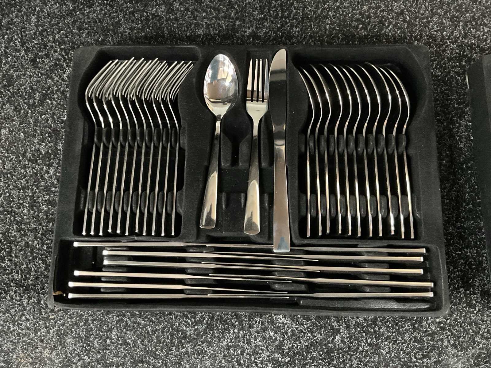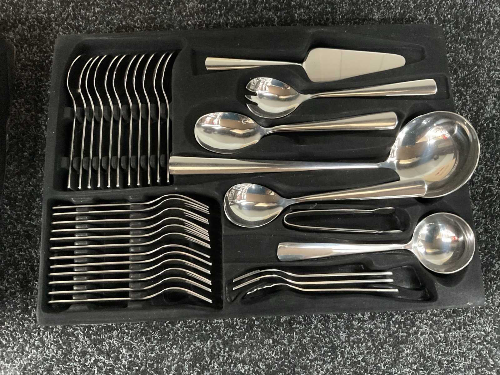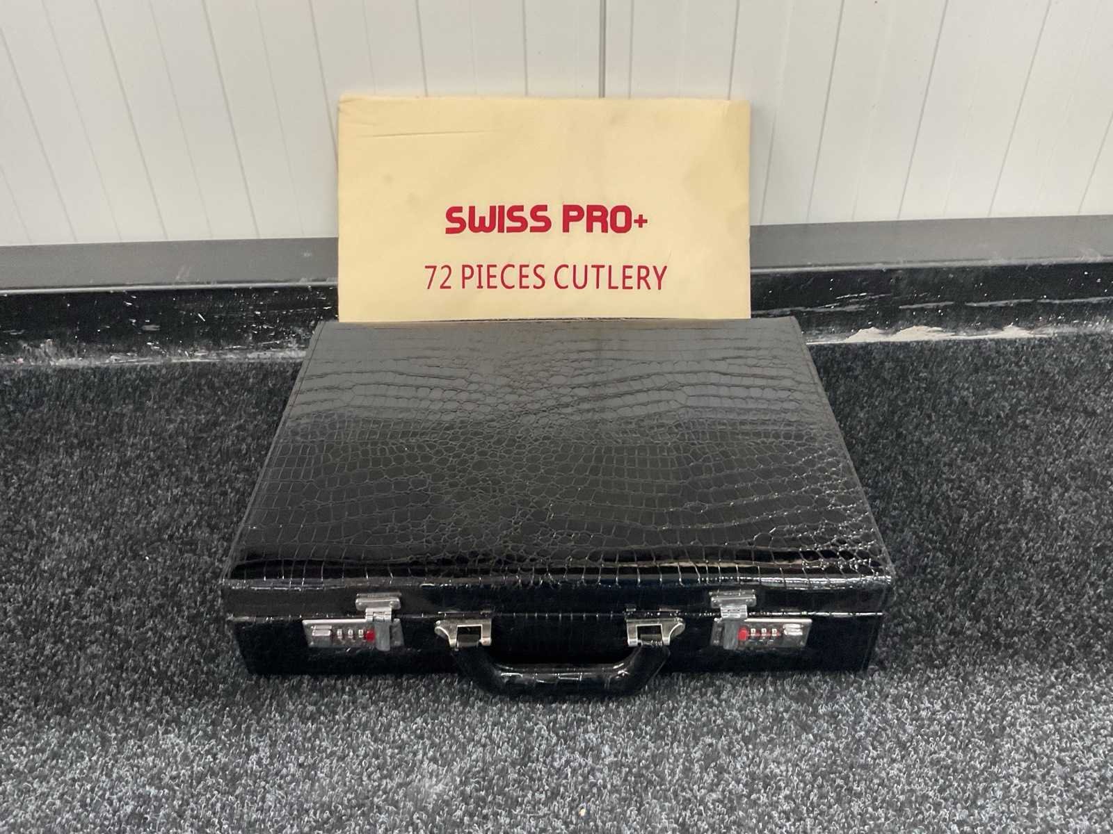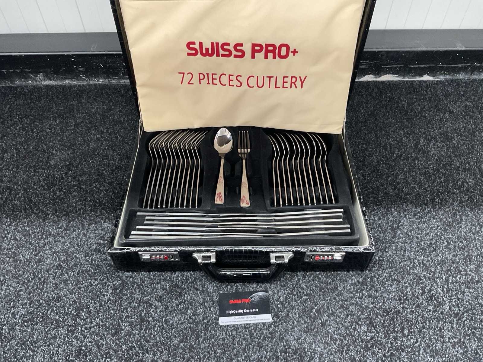 Voorzien van roestvrij staal; harde opbergkoffer met cijferslot; 12× tafelmes; 12× tafellepel; 12× tafelvork; 12× theelepel; 12× gebaksvorkje; 2× opscheplepel; 2× vleesvork; 1× saladelepel; 1× saladevork; 1× soeplepel; 1× suikerlepel; 1× taartschep; 1× juslepel; 1× extra opscheplepel; 1× suikertang; geschikt voor vaatwasser; ongebruikt in koffer Merk: Swiss Pro+ Type: Koffer Totale afmeting L: 445mm Totale afmeting Breedte: 350mm Totale afmeting Hoogte: 105mm Eigen gewicht: 4.9kg