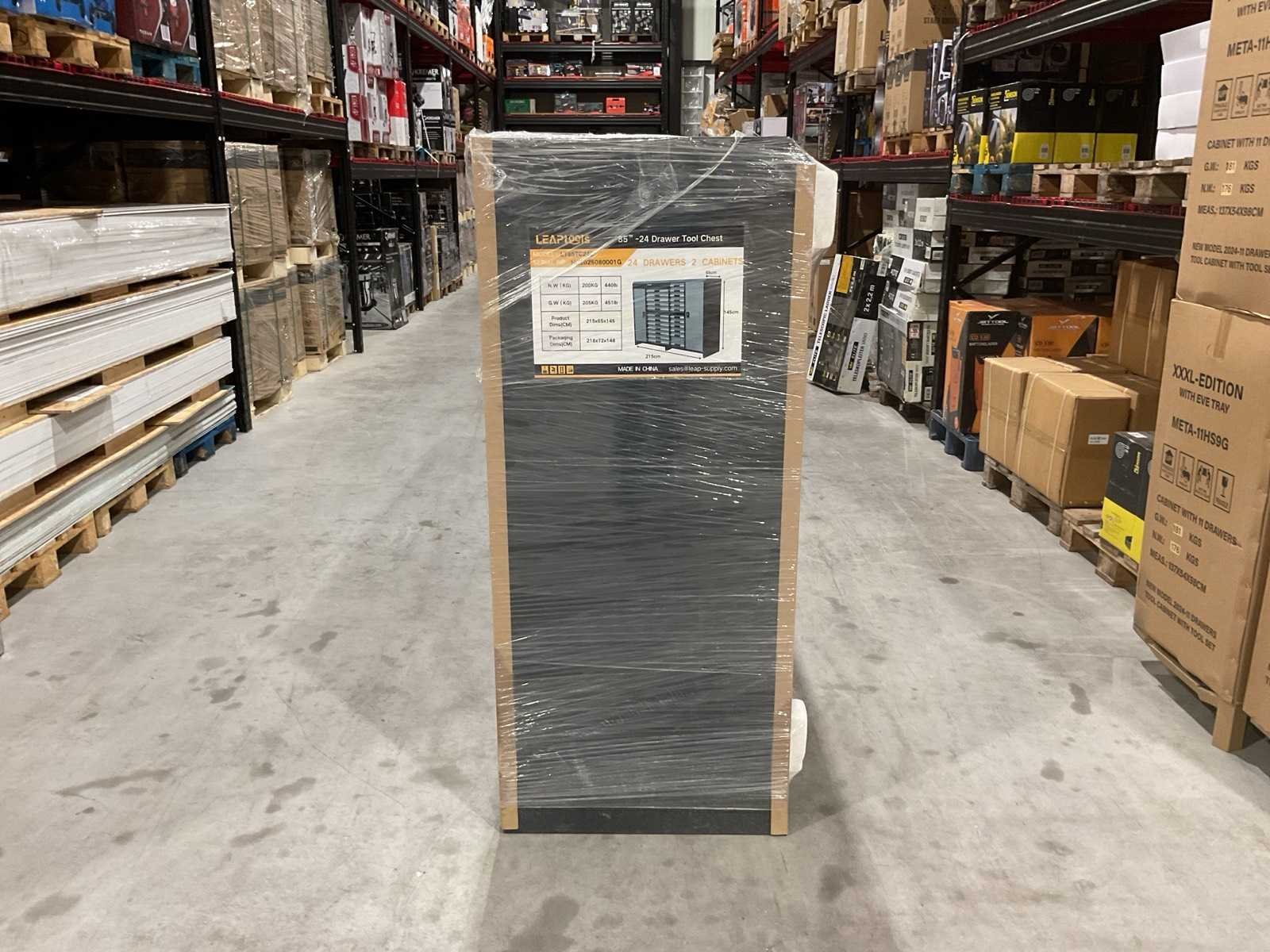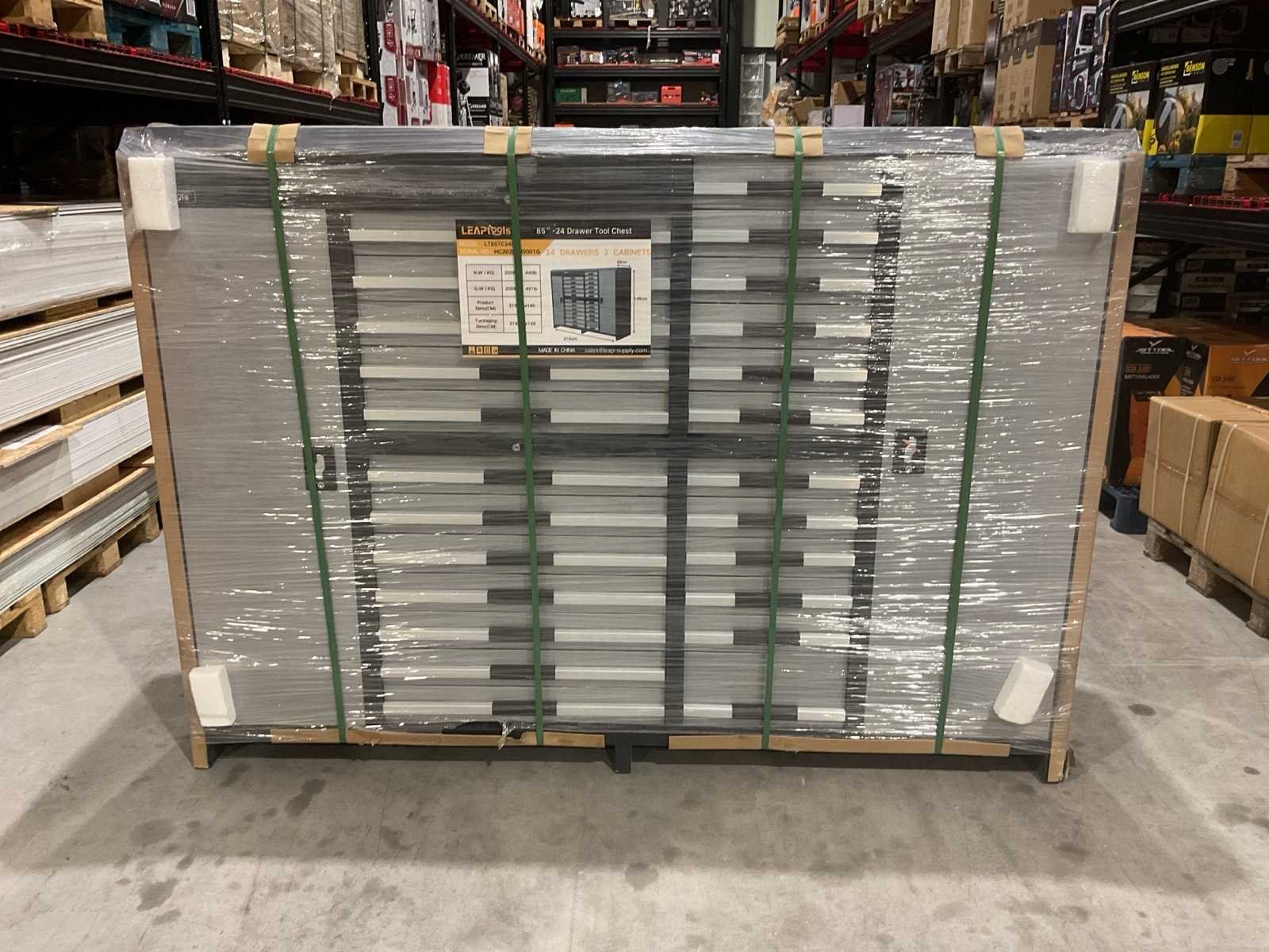Type: 85” (2159 mm) gereedschapskast; Aantal laden: 24 laden; Uitvoering: kast met 2 cabinet-delen; Materiaal: staal; ongebruikt in verpakking Merk: Leaptools Model: LT85TC24D Product type: 85” -24 Breedte: 650mm Gewicht: 200kg Lengte: 2150mm Hoogte: 1450mm