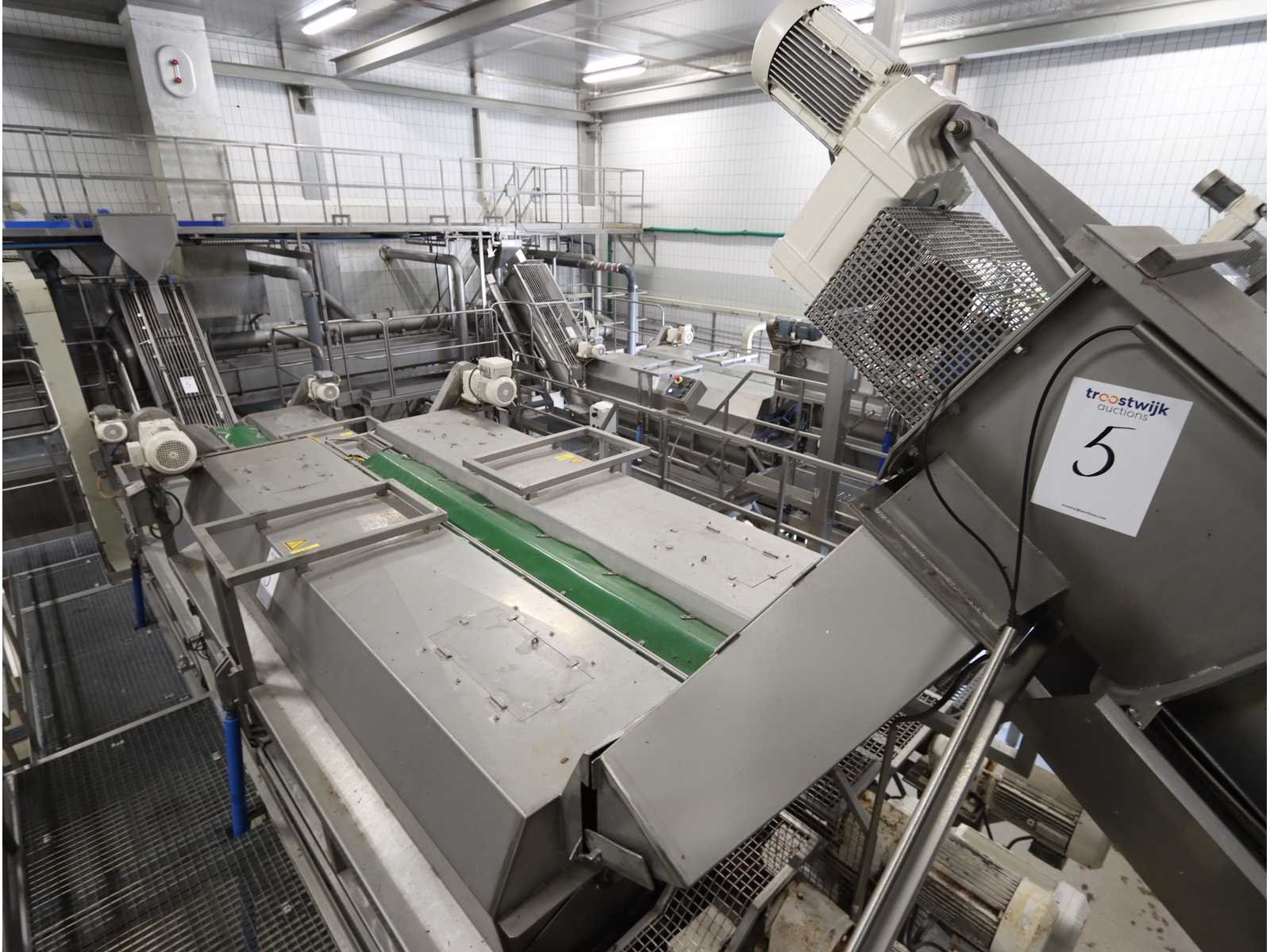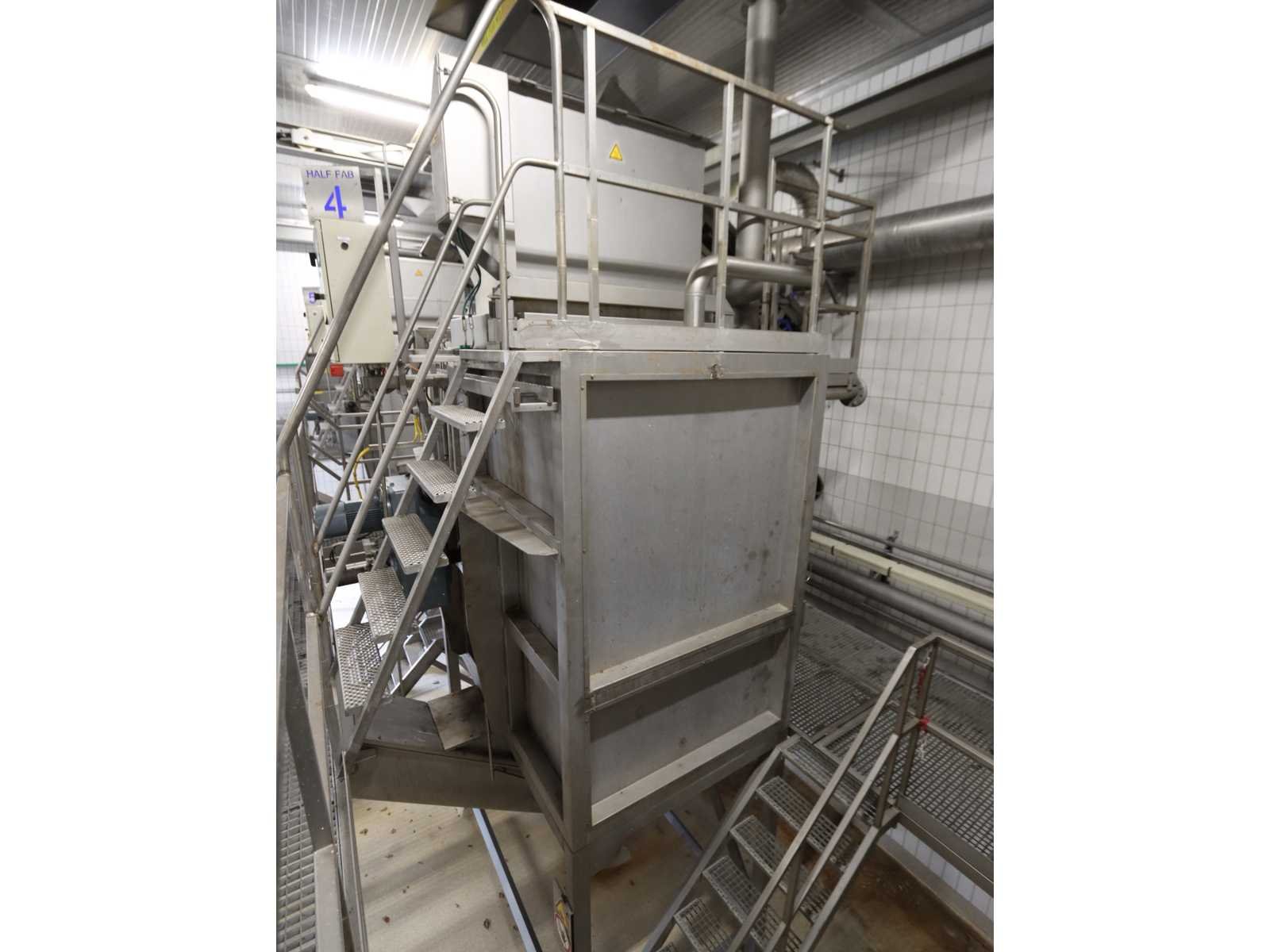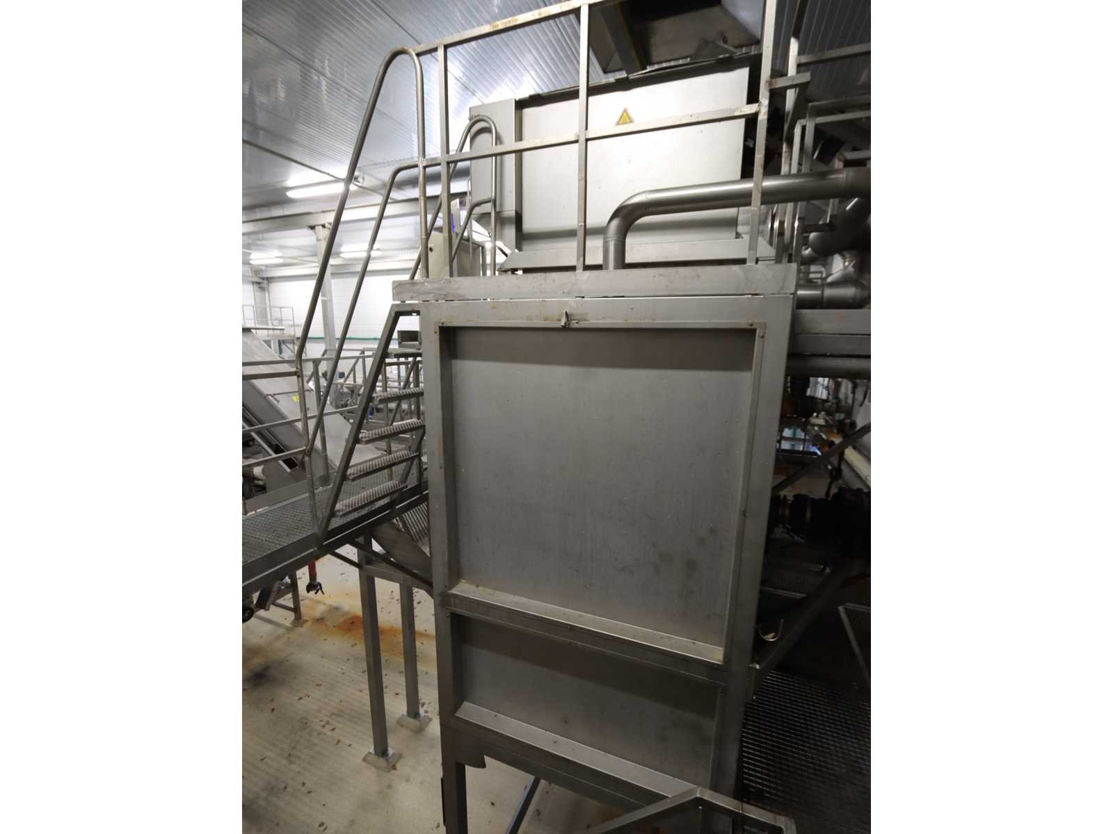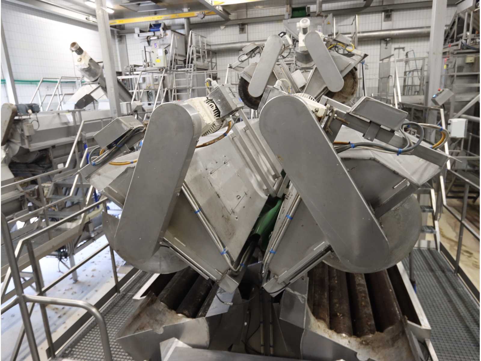 Bestaande uit: “Kiremko” stoomschiller voorzien van invoerbunker (afmeting circa 2400x3000x6000 mm), en onderlopende opvoer schroeftransporteur (lengte circa 6000 mm), “Agrico” 2-voudige ontveller en 2-voudige borstelmachine type AT-OBC-2500, werklengte 2500 mm, beide voorzien van schroeftransporteur, uitvoer schroeftransporteur (lengte 2500 mm) en opvang/filter bak met pomp (afmeting circa 1550x1070x1160 mm)(bordessen niet inbegrepen)