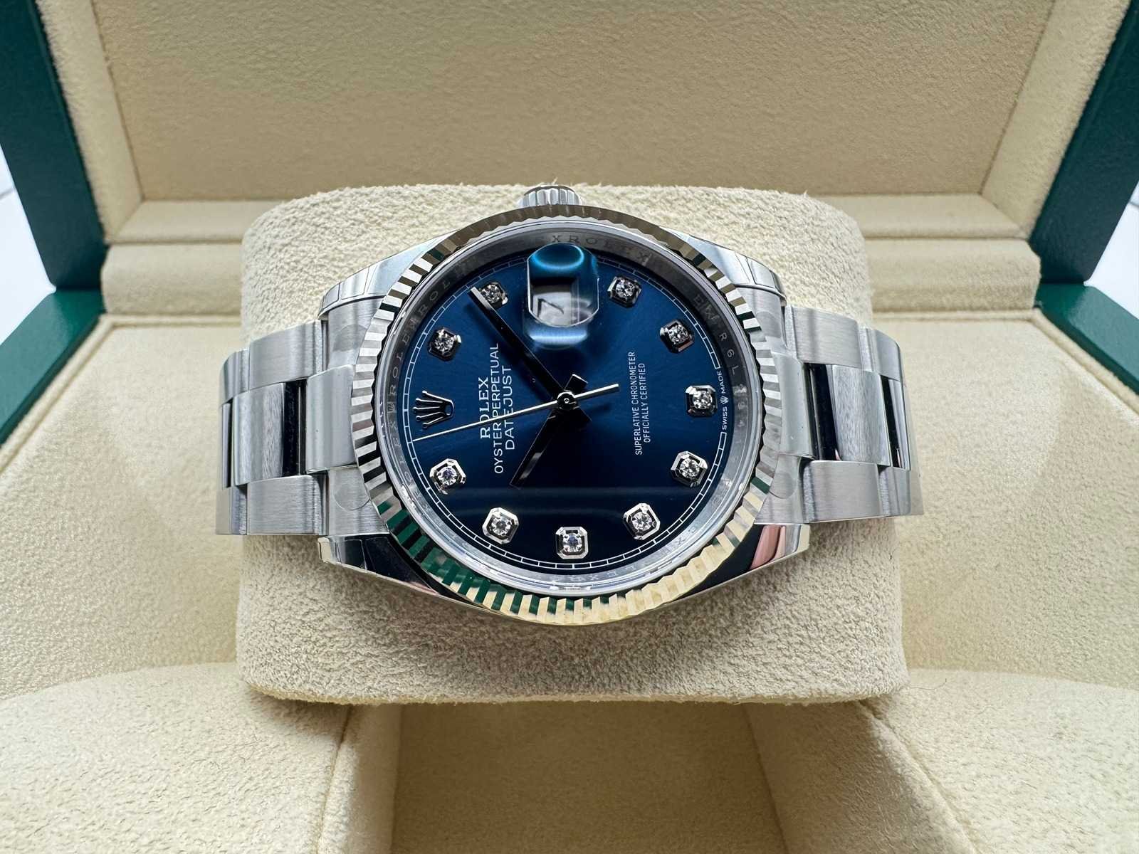 Key Features Reference: 126234 Year: 2026 Condition: Unworn Case: 36 mm Oyster case in Oystersteel Bezel: 18 ct white gold fluted bezel Dial: Blue dial with diamond dot hour markers Bracelet: Oyster bracelet A bold yet timeless configuration of the Datejust 36, pairing the vibrant blue diamond dial with the sporty Oyster bracelet and the signature white gold fluted bezel. Merk: Rolex Model: Datejust 36 Bouwjaar: 2026 Referentienummer: 126234 Materiaal kast: Steel Materiaal horlogeband: Steel Oyster Fluted Materiaal sluiting: Steel Wijzerplaat: Blue Diamond Dot Kastmaat: 36 mm