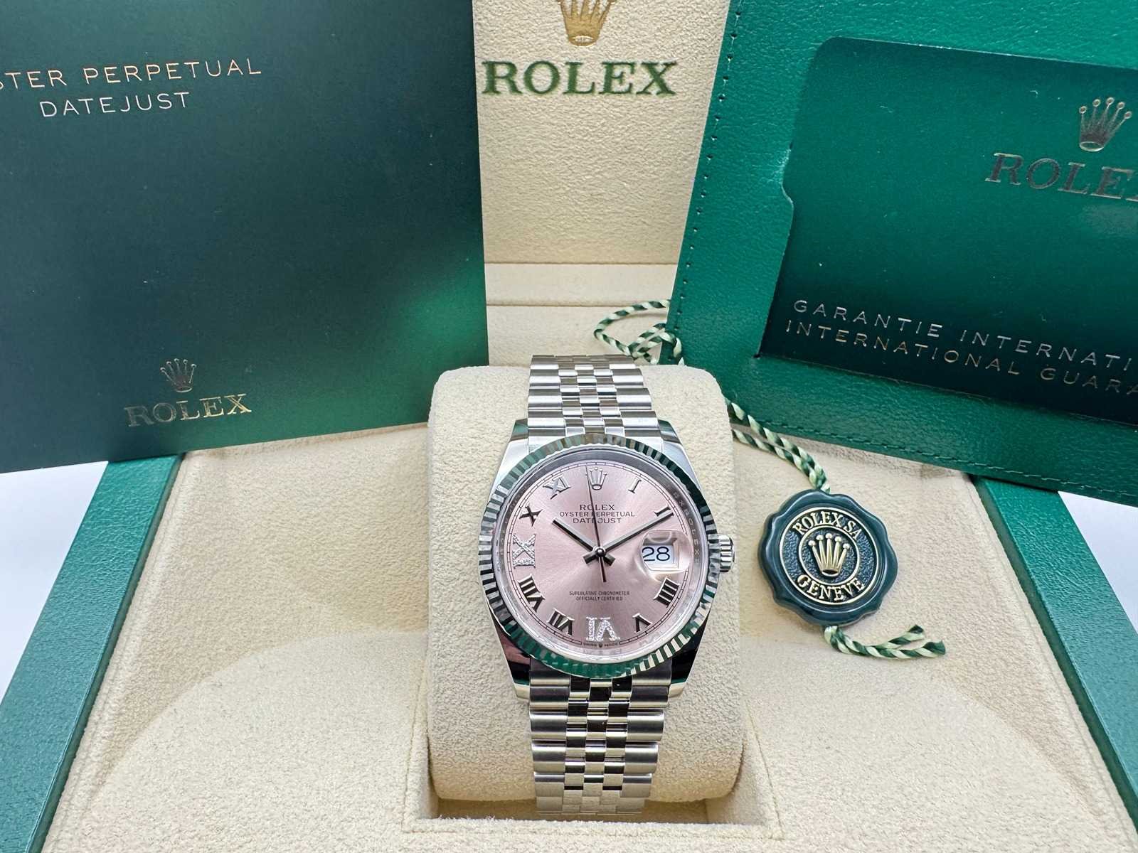 Key Features Reference: 126234 Year: 2026 Condition: Unworn Case: 36 mm Oyster case in Oystersteel Bezel: 18 ct white gold fluted bezel Dial: Pink dial with diamond hour markers, featuring diamond-set 6 & 9 Movement: Rolex Calibre 3235, automatic Power Reserve: Approx. 70 hours Bracelet: Jubilee bracelet Merk: Rolex Model: Datejust 36 Bouwjaar: 2026 Referentienummer: 126234 Materiaal kast: Steel Materiaal horlogeband: Steel Jubilee Fluted Materiaal sluiting: Steel Wijzerplaat: Pink With Diamonds On 6&9