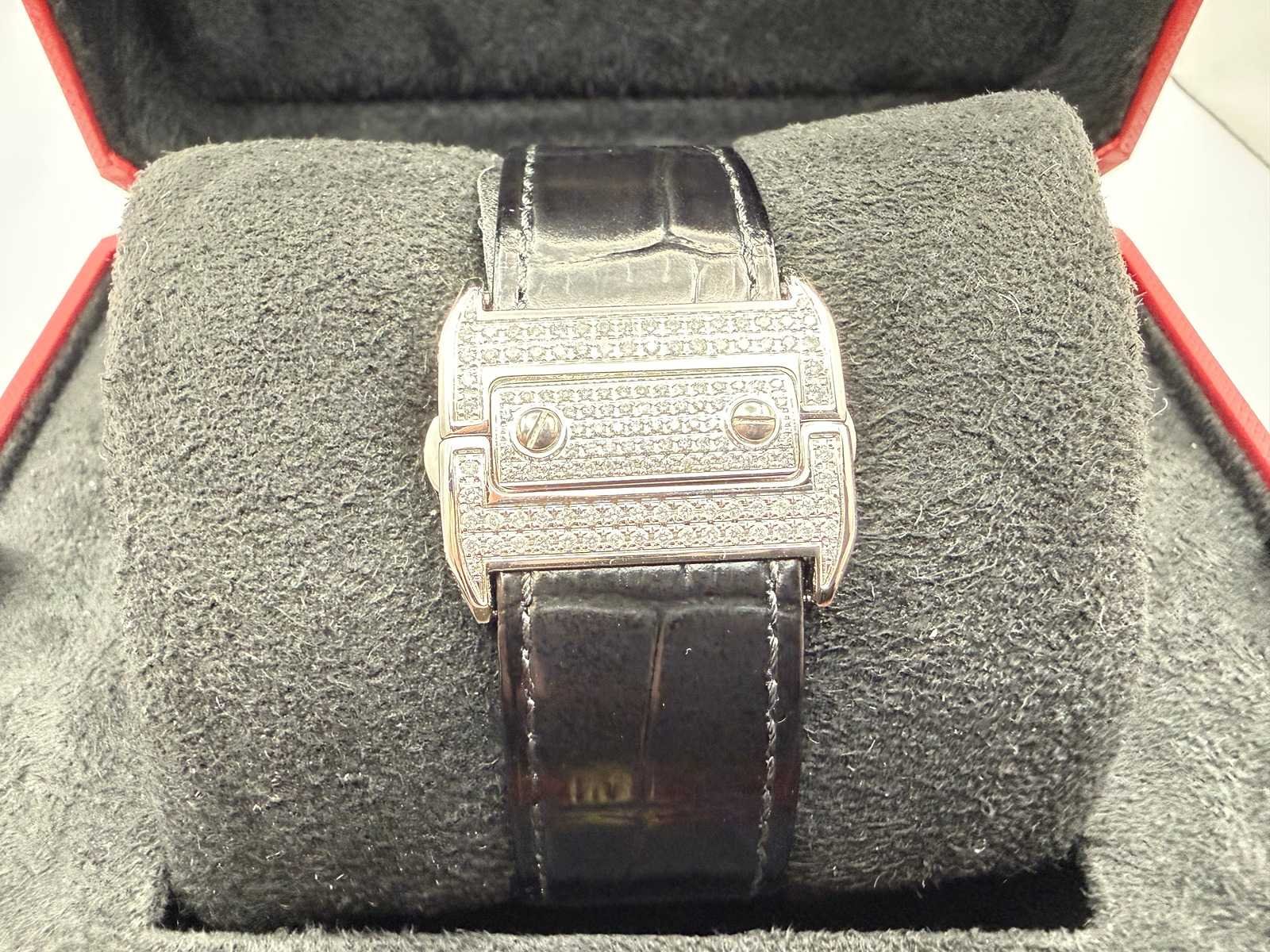 Model: Cartier Santos 100 Medium Case & Dial: Fully iced out with real genuine natural VS diamonds Bezel: Moissanite baguette stones Documents: No Strap: High-quality leather strap Condition: Custom luxury piece Style: Exclusive, bold, and elegant Please note: this is a customised watch, meaning it may include components that differ from the original factory specifications. Customisation can vary widely, so we highlight the following possibilities for full transparency: Aftermarket parts The watch may include third-party components (such as bezels, dials, hands, crystals or gem settings) that are not produced by the brand owner. These parts are often added for aesthetic reasons, but are not considered original by the manufacturer. Original parts from other models Some components (e.g. dials or bracelets) may have been sourced from other genuine watches by the same brand. While these parts are authentic, they were not originally fitted to this particular model or reference, which may affect collectability or eligibility for manufacturer service. Non-original parts In some cases, customised watches may include parts that are neither original nor manufactured by the brand. These components can affect the watch’s value. We encourage all bidders to carefully review the photos and description before placing a bid. Keep in mind: customised watches may not be eligible for official service or warranty from the brand. All bids should be placed with full awareness of the customisation status described above. Merk: Cartier Model: Santos 100 XL Bouwjaar: 2022 Referentienummer: 2656 Materiaal kast: Diamonds Materiaal horlogeband: Leer Materiaal sluiting: Diamonds Wijzerplaat: Diamonds Kastmaat: 38 mm