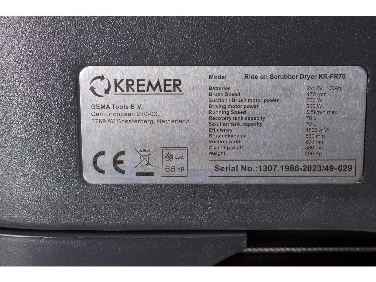 Batteries: 2 x 12 V, 100 Ah; Brush Speed: 170 rpm; Suction / Brush motor power: 500 W; Driving motor power: 300 W; Running Speed: 5.5km/h max; Recovery tank capacity: 70 L; Solution tank capacity: 70 L; Efficiency: 4500 m²/h; Brush diameter: 560 mm; Suction width: 800 mm; Cleaning width: 560 mm ;4866 Merk: Kremer Type: KR-FR70 Bouwjaar: 2025 Werkbreedte: 630mm Elektrisch: true Afgelezen urenstand: 0hr Accu lader: true Aansluiting: 24V Eigen gewicht: 220kg Totale afmeting L: 1310mm Totale afmeting Breedte: 620mm Totale afmeting Hoogte: 1080mm