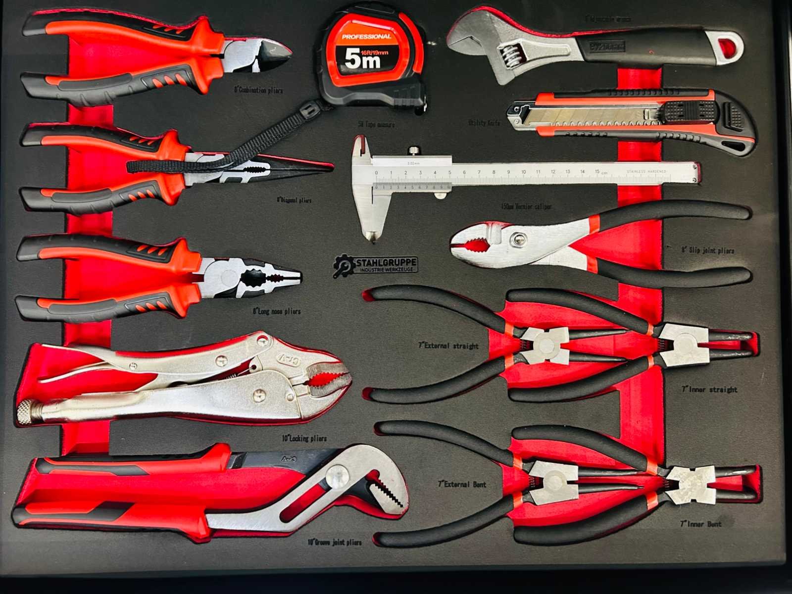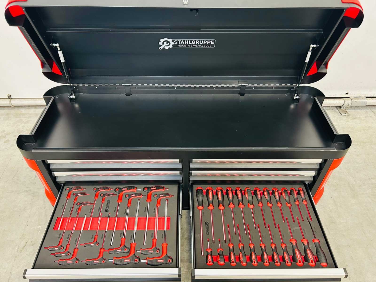 Kar met afneembare topbox; topbox met 8 laden en boven klep; Kar met 5 laden en kast met dubbele openslaande deuren; 13laden - 9 gevuld; 2 zwenkwielen waarvan 2 geremd; 7212 Merk: Stahlgruppe Model: SG2024 Type: 327-delige Kleur: rood - zwart Gewicht: 215kg Lengte: 144cm Breedte: 54cm Hoogte: 154cm