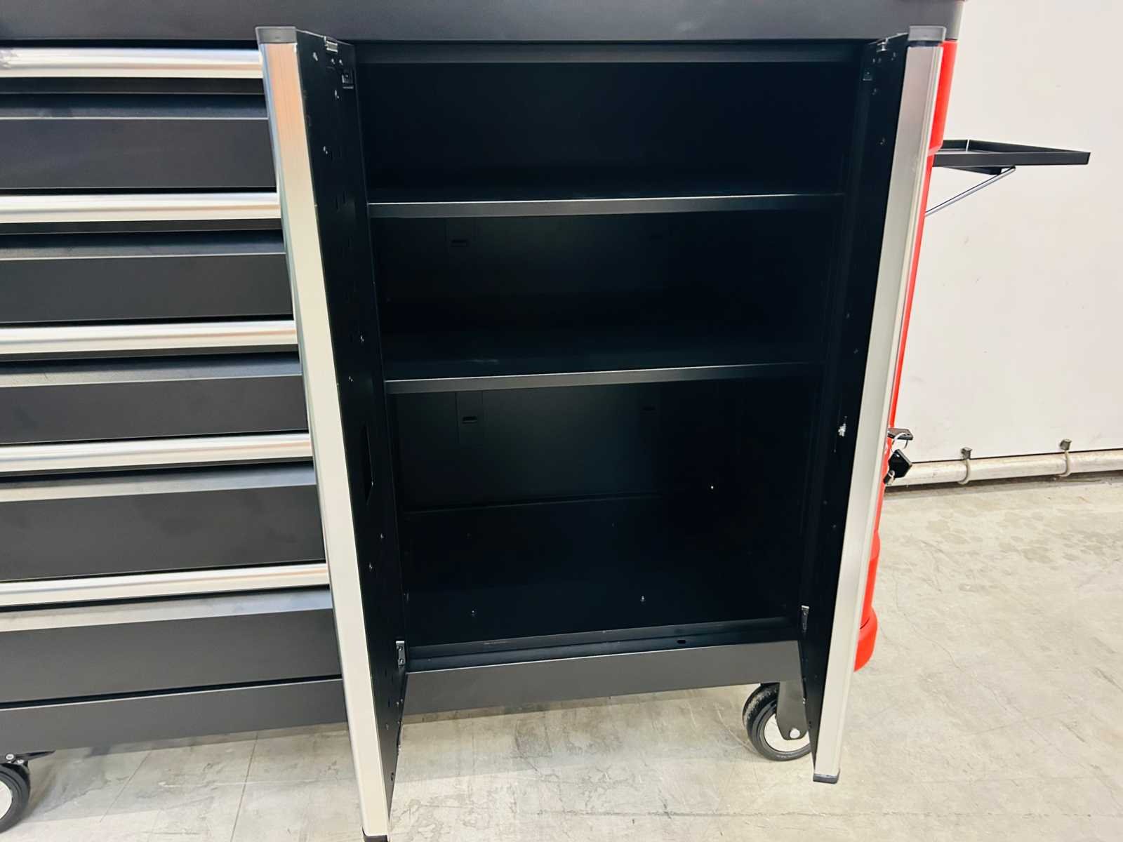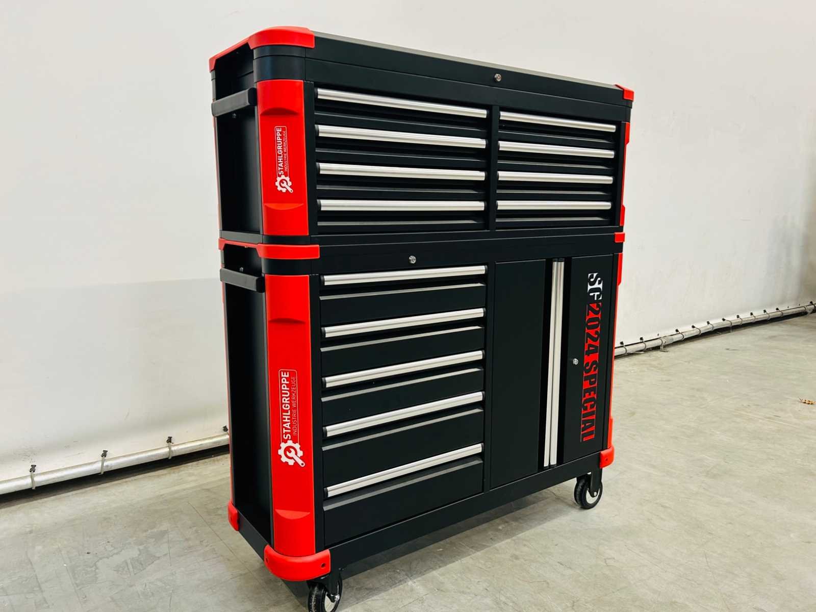 Kar met afneembare topbox; topbox met 8 laden en boven klep; Kar met 5 laden en kast met dubbele openslaande deuren; 13laden - 9 gevuld; 2 zwenkwielen waarvan 2 geremd; 7212 Merk: Stahlgruppe Model: SG2024 Type: 327-delige Kleur: rood - zwart Gewicht: 215kg Lengte: 144cm Breedte: 54cm Hoogte: 154cm