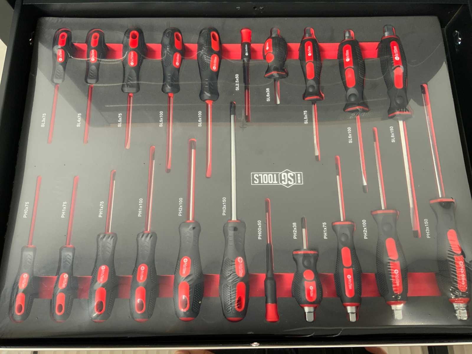 258 delig; schroevendraaiers; bitset; tangen; sleutels; etc; zwenkwielen met rem; 7 lades; 6 gevuld; Merk: Stahlgruppe Type: SG11 Bouwjaar: 2023 Aantal laden: 7 Met inhoud: true Eigen gewicht: 80kg Totale afmeting L: 760mm Totale afmeting Breedte: 460mm Totale afmeting Hoogte: 980mm