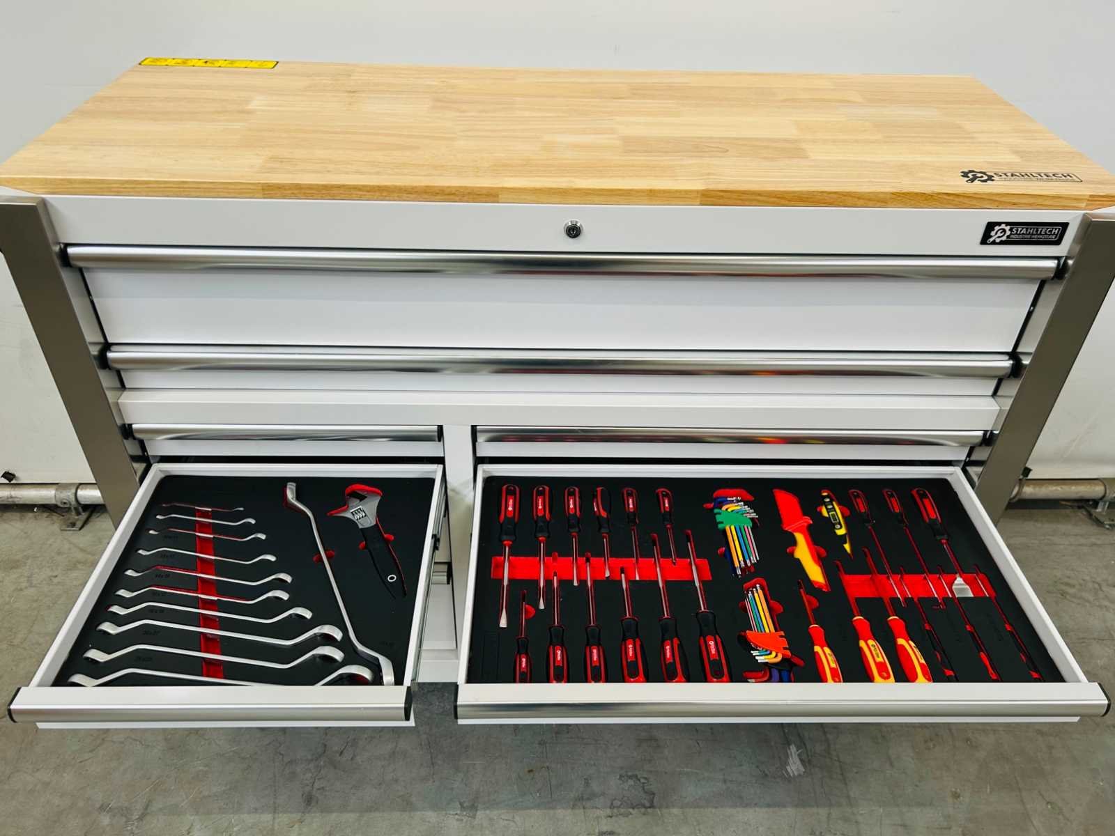 Ongebruikt; gereedschap in plastic verpakt; 12-delig tangenset; 13-delig hamerset; 14-delig meetset; 36-delig slagmoersleutel set; 21-delig sleutels met T-greep; 41-delig schroevendraaierset; 29-delig combinatiesleutels; 12-delig ringsleutels; 125-delig doppenset; 84-delig bitjes set; 7483 Merk: Stahltech Type: 387-delig Lengte: 148cm Breedte: 52cm Hoogte: 110cm