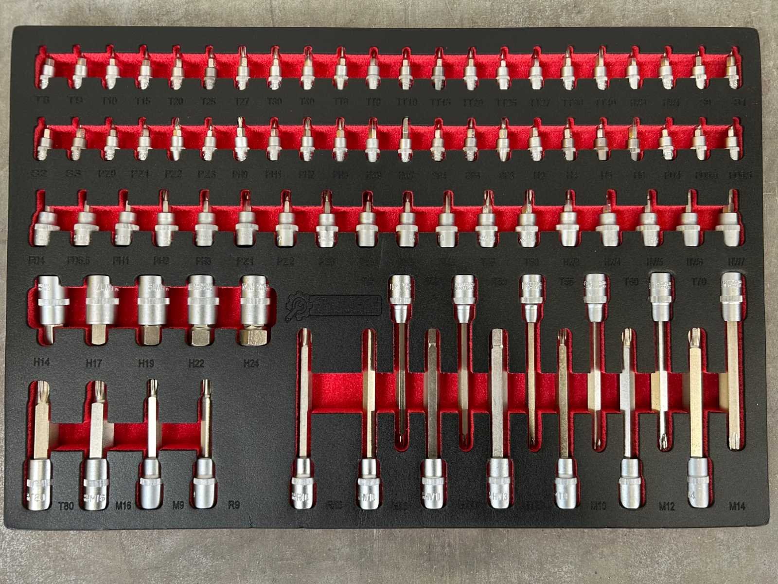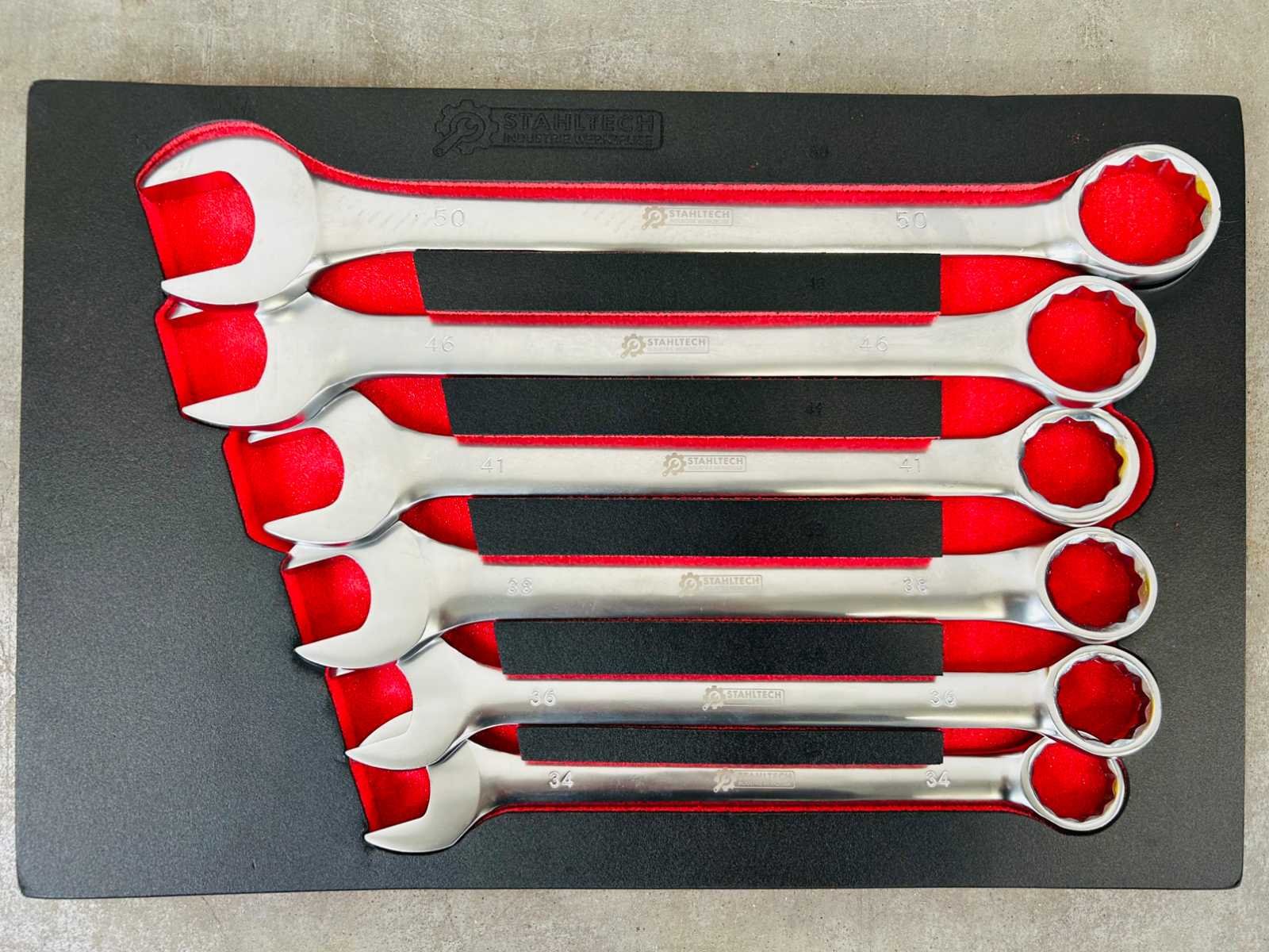 Ongebruikt; gereedschap in plastic verpakt; 12-delig tangenset; 13-delig hamerset; 14-delig meetset; 36-delig slagmoersleutel set; 21-delig sleutels met T-greep; 41-delig schroevendraaierset; 29-delig combinatiesleutels; 12-delig ringsleutels; 125-delig doppenset; 84-delig bitjes set; 7483 Merk: Stahltech Type: 387-delig Lengte: 148cm Breedte: 52cm Hoogte: 110cm