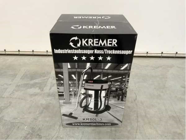 Ongebruikt in doos; v.v. 2 zwenkwielen; afvoerslang; 3 motoren apart in te schakelen; diverse hulpstukken; rvs reservoir van 80 liter inhoud; 3866 ; Merk: Kremer Type: KR80L-3 Bouwjaar: 2024 Zakloos: true Nat/droog zuiger: true Stopcontact: false Aansluiting: 230V