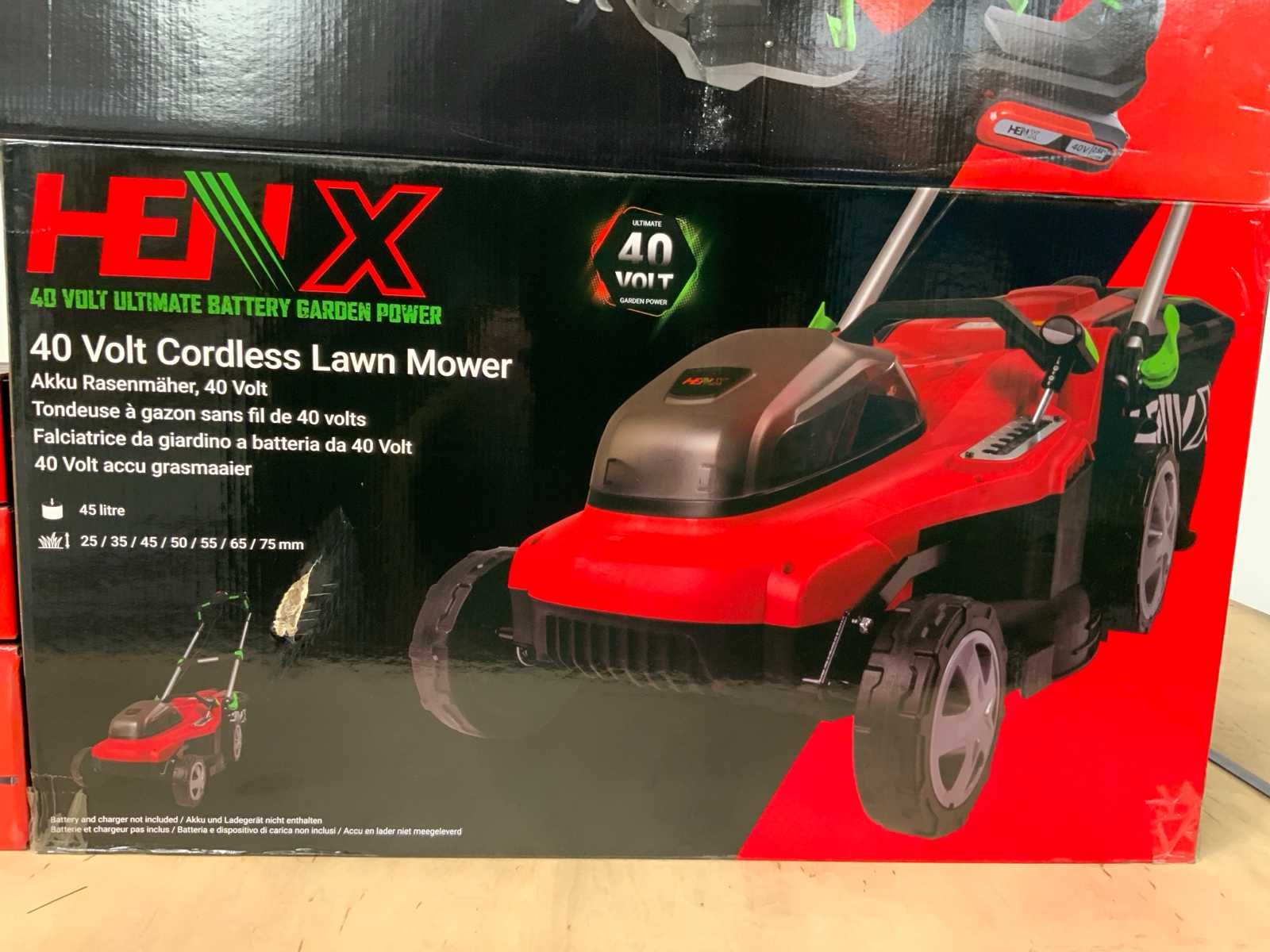 1 accu 2.5AH; 1x grasmaaier; 1x heggenschaar; 40V batterij waist belt; Merk: Henx