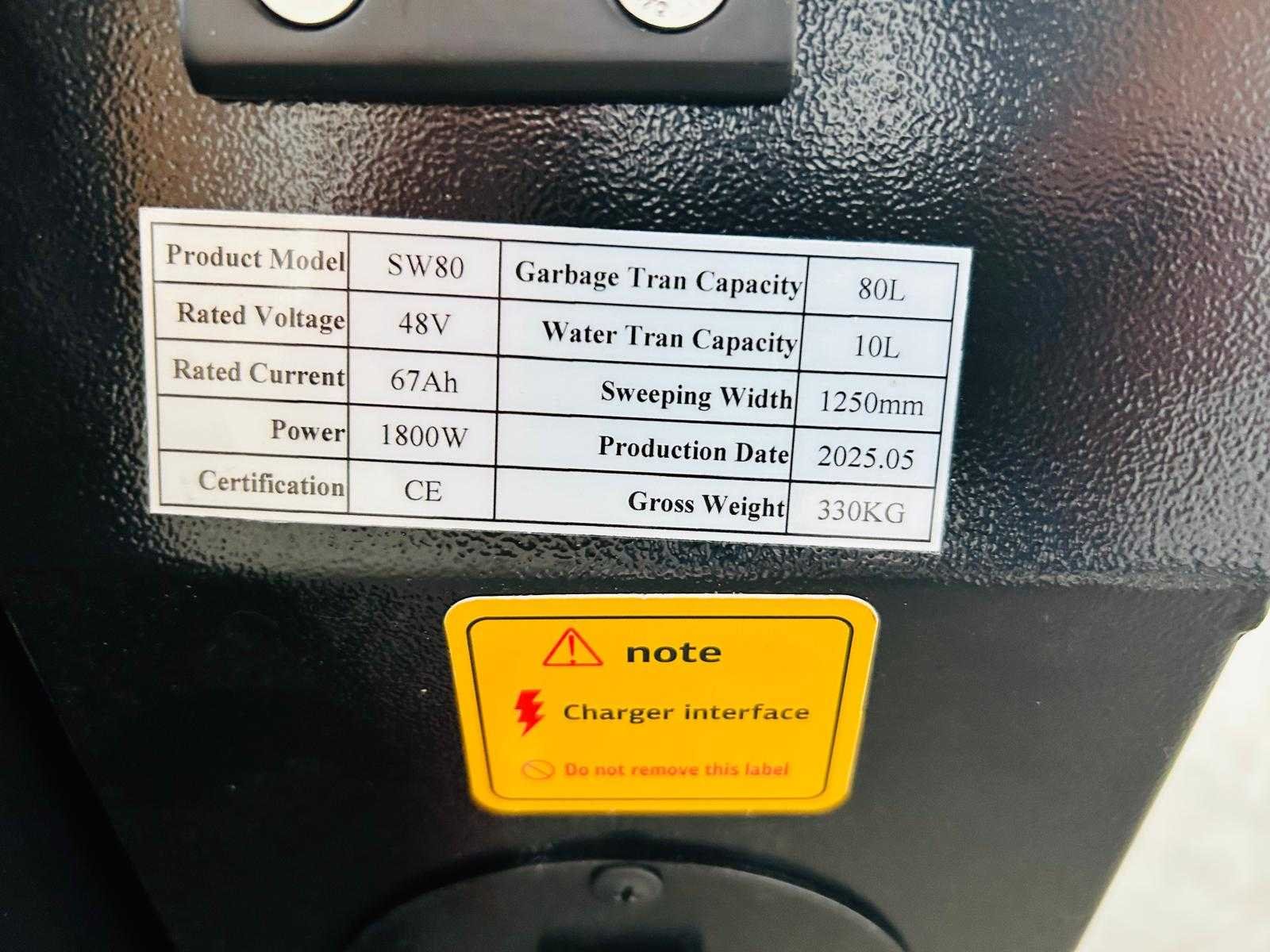 Sweeping width 1250 mm; Side brush width 2*400 mm; Side brush motor 2x90W; Battery capacity 48 v/ 67 ah * 4 pcs; Total weight 400 kgs; Width of main brush 500 mm; Drive motor 1000W; main brush motor 700w; vacuum motor 216w; water tank 10L; Work efficiency 6400 m2/h; Dustbin capacity 80L; verpakt in stalen frame; packing size 1670x092x145mm; 7529 Merk: RTE Type: SW80 Bouwjaar: 2025 Werkbreedte: 1250mm Elektrisch: true Afgelezen urenstand: 1hr Accu lader: true Eigen gewicht: 396kg Totale afmeting L: 1600mm Totale afmeting Breedte: 1250mm Totale afmeting Hoogte: 1300mm