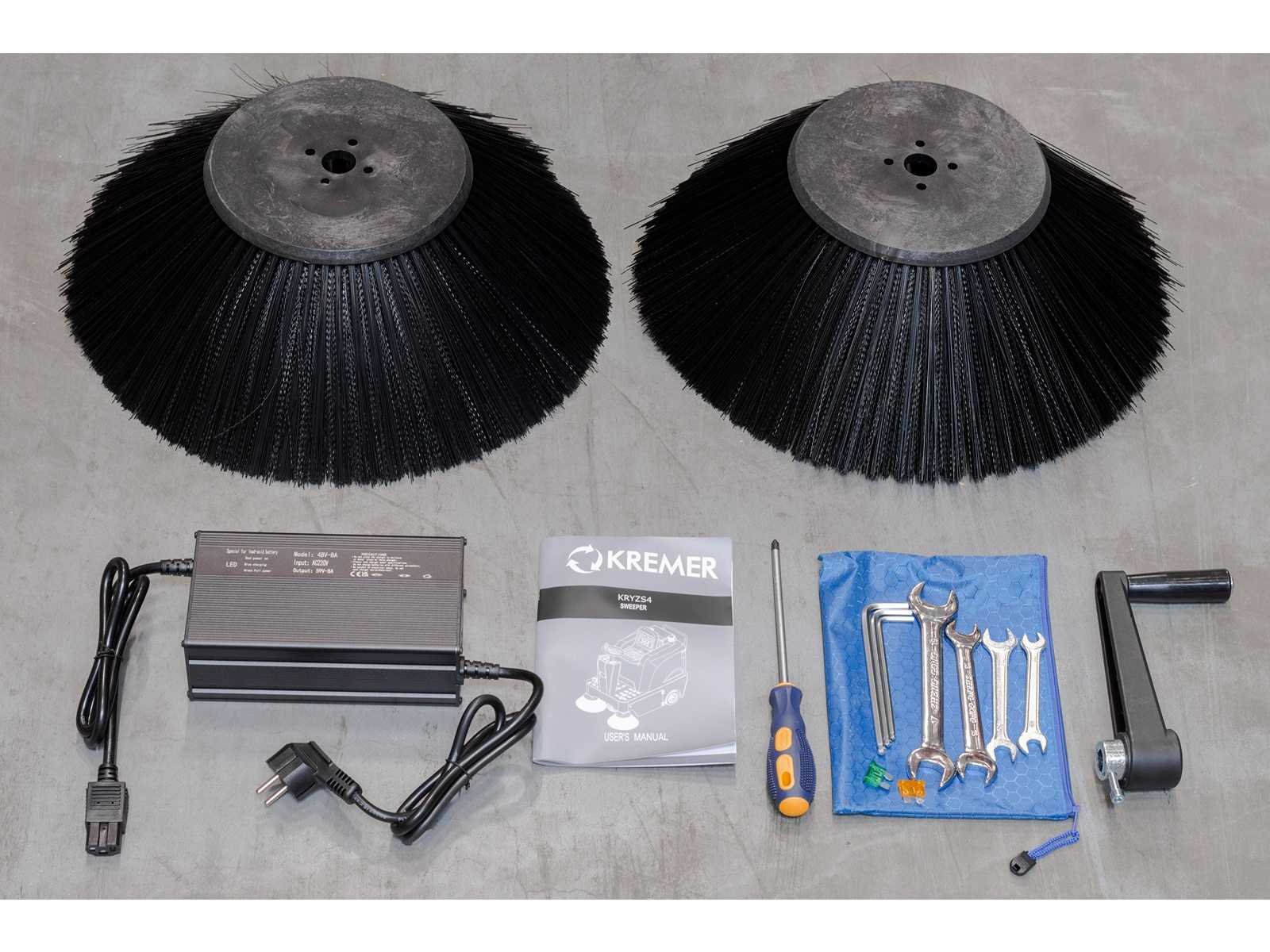 Sweeping width 1250 mm; Side brush width 2*400 mm; Walking motor 700 W; Battery capacity 48 v/ 65 ah * 4 pcs; Total weight 396 kgs; Width of main brush 500 mm; Work efficiency 6380 m2/h; Garbage capacity 80L; Roller brush motor 700W; Walking speed 0-10 Km/h; 80 liter vuilcontainer inhoud; 4782 Merk: Kremer Type: KRYZS4 Bouwjaar: 2025 Elektrisch aangedreven: true Met oplader: true Eigen gewicht: 396kg Werkbreedte: 1250mm Totale afmeting L: 1600mm Totale afmeting Breedte: 1160mm Totale afmeting Hoogte: 1300mm