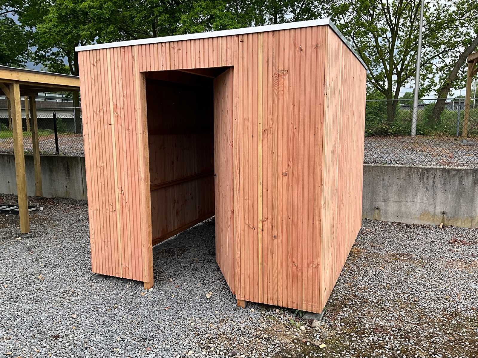 Modern Model Tuinhuis Kenmerken: De deur kan naar wens in de lange of korte zijde worden gemonteerd. Daarnaast kan de deur zowel aan de linker- als aan de rechterkant worden geplaatst. De draairichting kan naar links of naar rechts worden ingesteld. Materiaal: Palen: 12x12 cm Douglas Dakbalken: 5x15 cm Douglas Regelwerk: 5x7 cm Vuren Wanden: 2 cm dikke Triple Douglas planken Dakplanken: 1,8 cm dikke Douglas planken Dakbedekking: EPDM dakfolie met lijm en dakdoorvoer Daktrim: Aluminium Levering: Geheel geleverd als bouwpakket Afmetingen pakket: 120 x 100 x 300 cm Gewicht pakket: 900 kg Model: Tuinhuis Product type: Modern Gewicht: 900kg Lengte: 295cm Breedte: 295cm Hoogte: 240cm Materiaal: Douglas