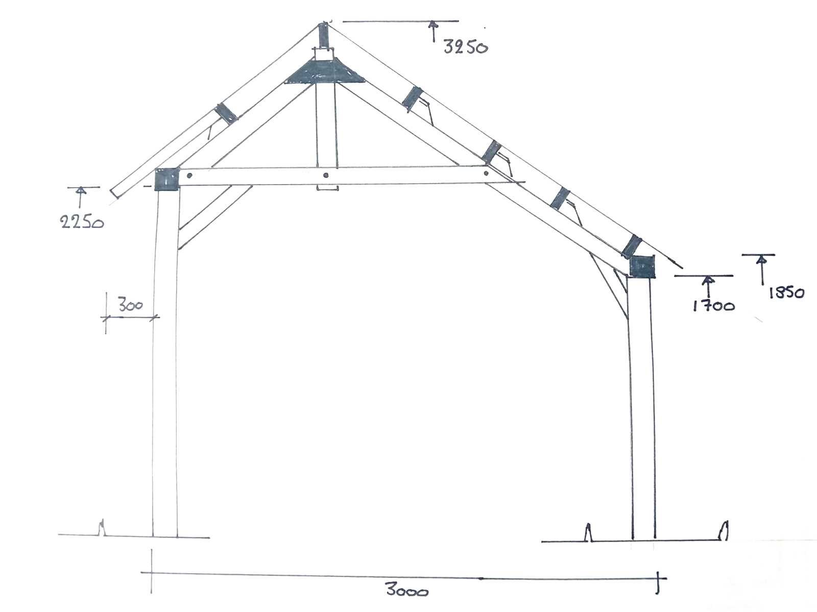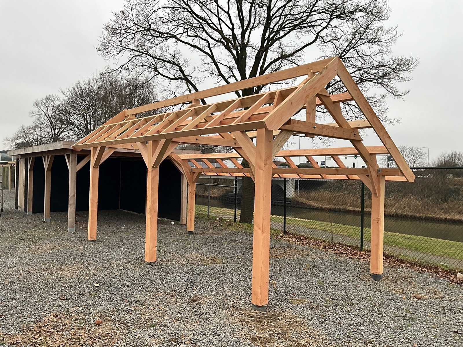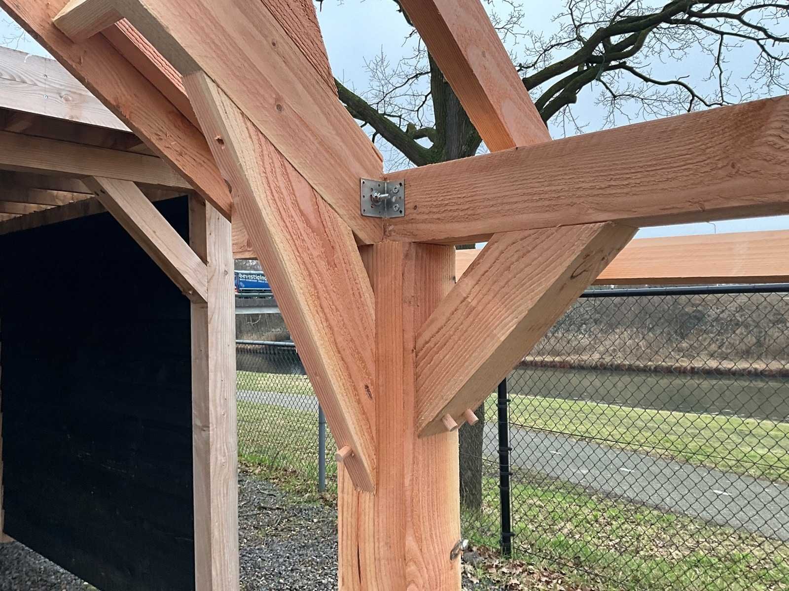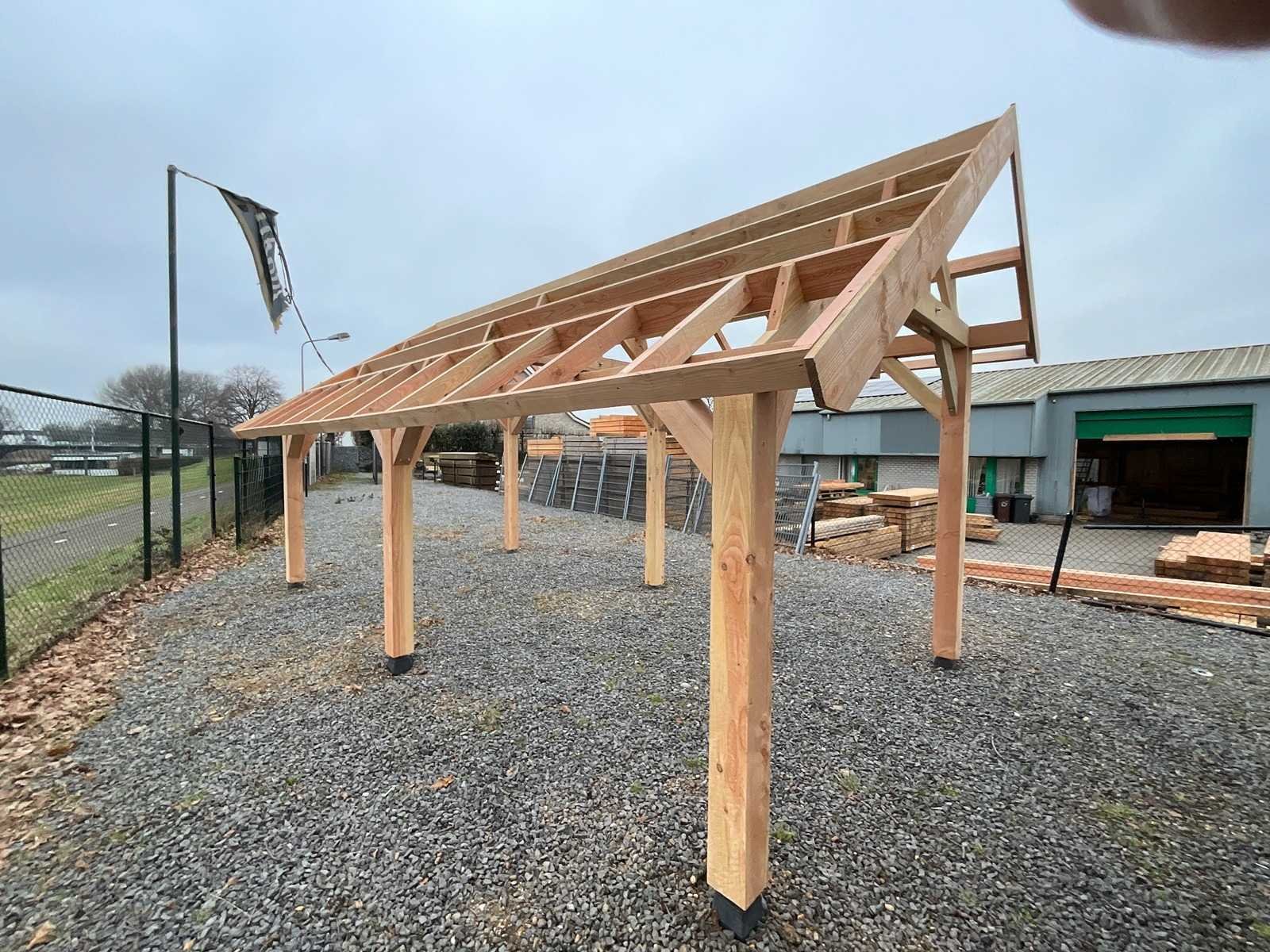Constructie zonder dakbeschot Palen 150x150mm Douglas fijnbezaagd (6st.) Ligger voorzijde 150x150mm ligger achterzijde 120x120mm Spant 50x150mm Schoren 120x120mm 50x150mm dakbalken 50x150mm boeideel 20x200mm 20x100mm Dakmaat 5600x3600mm Buitenzijde palen 5000x3000mm Afmeting Pakket: 350x125x140cm, 1000kg Geleverd in een bouwpakket Alle onderdelen op maat gezaagd Geleverd met handleiding en bevestigingsmateriaal Geleverd zonder grondpoeren Houtsoort: Douglas Bevestigingsmateriaal: true Constructieplan: true Eigen gewicht: 1000 Totale afmeting L: 5600 Totale afmeting Breedte: 3600 Totale afmeting Hoogte: 3250 Verpakt per: 1 pakket Verpakking afm. l: 3500mm Verpakking afm. w: 1250mm Verpakking afm. h: 1400mm