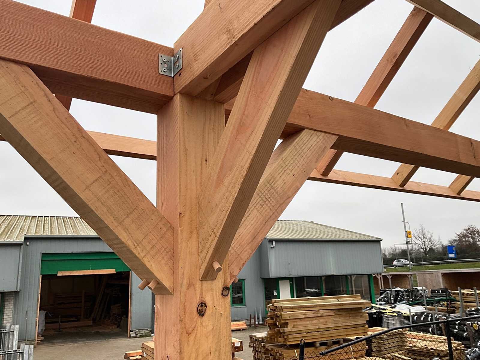 Dakvrije Structuur Palen: 150x150mm Douglas (12 stuks) Voorste ligger: 150x150mm Achterste ligger: 120x120mm Spant: 50x150mm Schoren: 120x120mm, 50x150mm Dakbalken: 50x150mm Boeideel: 20x200mm, 20x100mm Dakafmeting: 15600x3600mm Buitenafmeting palen: 1500x3000mm Geleverd in bouwpakket: 350x125x165 cm, 1.800 kg Alle onderdelen op maat gezaagd Inclusief handleiding en bevestigingsmateriaal Grondpoeren niet inbegrepen Product type: Kapschuur-traditionele Houtsoort: Douglas Bevestigingsmateriaal: true Constructieplan: true Eigen gewicht: 1800 Totale afmeting L: 15600 Totale afmeting Breedte: 3600 Totale afmeting Hoogte: 3250 Verpakt per: 1 pakket Verpakking afm. l: 3500mm Verpakking afm. w: 1250mm Verpakking afm. h: 1650mm
