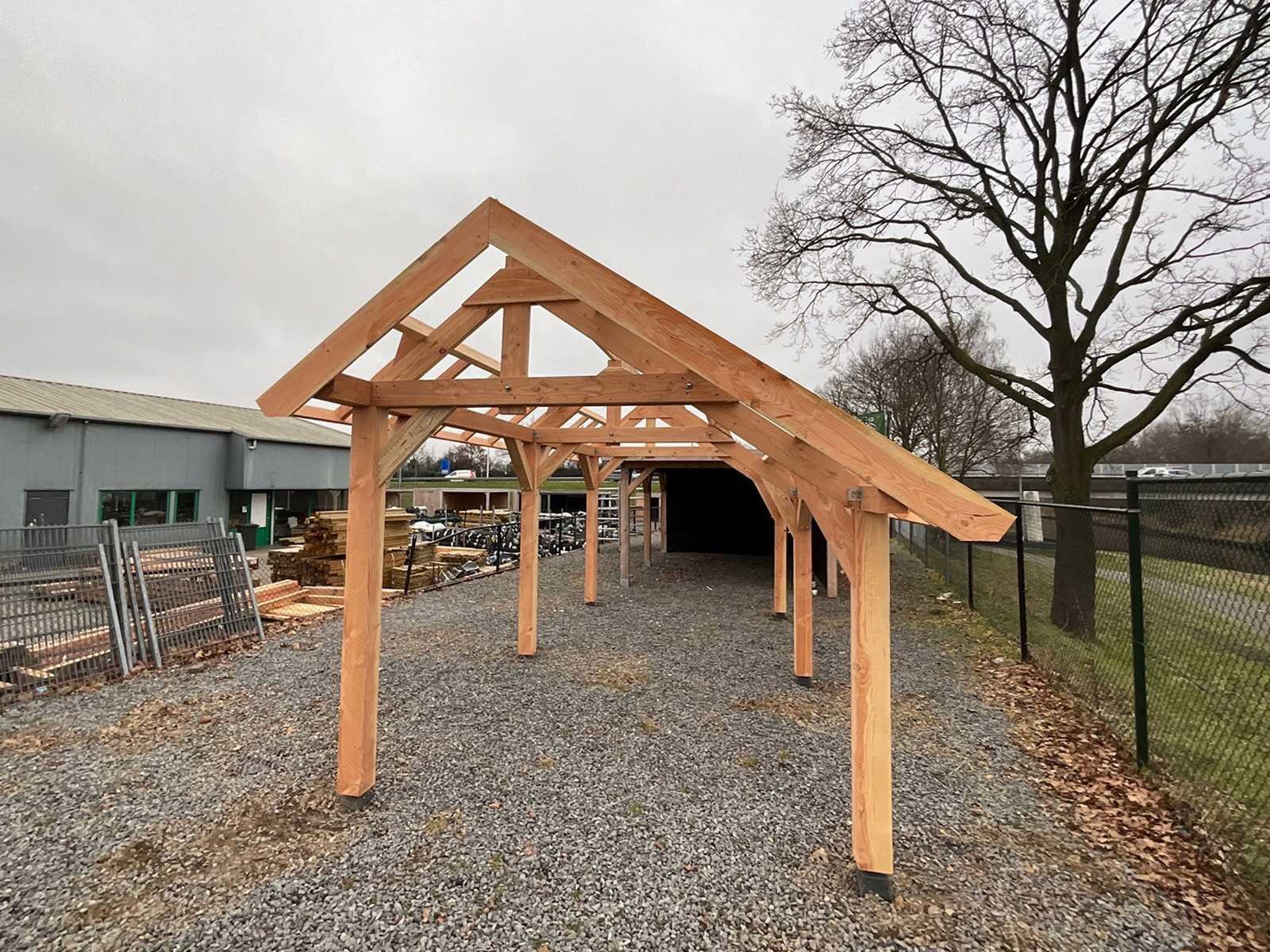 Constructie zonder dakbeschot Palen 150x150 mm douglas fijnbezaagd (10 st.) Ligger voorzijde 150x150 mm Ligger achterzijde 120x120 mm Spant 50x150 mm Schoren 120x120 mm, 50x150 mm Dakbalken 50x150 mm Boeideel 20x200 mm, 20x100 mm Dakmaat 12600x3600 mm Buitenzijde palen 12000x3000 mm Geleverd in een bouwpakket: 350x125x160 cm, 1.650kg. Alle onderdelen op maat gezaagd Incl. handleiding en bevestigingsmateriaal Grondpoeren niet inbegrepen Product type: Kapschuur-traditionele Houtsoort: Douglas Bevestigingsmateriaal: true Constructieplan: true Eigen gewicht: 1650 Totale afmeting L: 12600 Totale afmeting Breedte: 3600 Totale afmeting Hoogte: 3250 Verpakt per: 1 pakket Verpakking afm. l: 3500mm Verpakking afm. w: 1250mm Verpakking afm. h: 1600mm