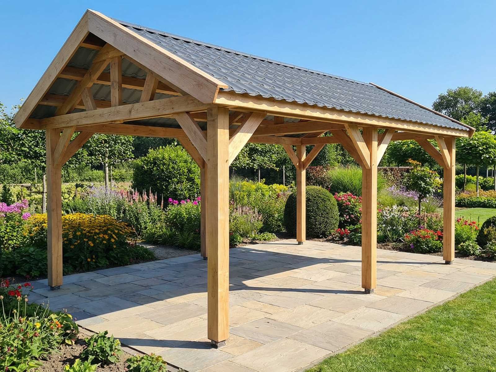 Deze frameconstructie met een klassiek zadeldak is gemaakt van fijnbezaagd Douglas-hout en wordt geleverd als bouwpakket. Het pakket bevat de volgende onderdelen: Palen: 150x150mm fijnbezaagd Douglas ( 10 stuks ) Spant onderdelen: 50x150mm fijnbezaagd Douglas Dakbalken: 50x150mm fijnbezaagd Douglas Doeideel: 20x200mm fijnbezaagd Douglas Dakpanplaat staal ral 7016 antraciet grijs De afmetingen zijn buitenwerks gemeten vanaf het dak. Bij een breedte van 410 cm staan de palen buitenwerks op 360 cm, zoals aangegeven in de schets. Het bouwpakket is op maat gezaagd en wordt geleverd inclusief bevestigingsmateriaal en handleiding. Betonpoeren zijn niet inbegrepen. Afmetingen pakket: 420x125x160cm, 1450kg Model: Zadeldak Product type: Vrijstaande overkapping Gewicht: 1450kg Lengte: 1220cm Breedte: 410cm Hoogte: 340cm Materiaal: Douglas