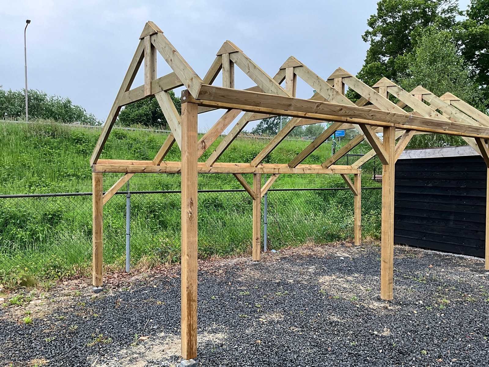 Palen: 11x11 cm geschaafd vuren ( 8 stuks ) Liggers: 12x12 cm geschaafd vuren Schoren: 9x9 cm geïmpregneerd vuren Boeien: 1,6x14 cm geïmpregneerd vuren Spanten: 4,5x14,5 cm geïmpregneerd vuren Het geheel is volledig op maat gezaagd en wordt geleverd met handleiding en bevestigingsmateriaal. Grondpoeren zijn niet inbegrepen. Het kavel wordt geleverd in bouwpakketvorm, met afmetingen van 125x125x300 cm en een gewicht van 900 kg. Gewicht: 900kg Lengte: 900cm Breedte: 300cm Hoogte: 322cm Materiaal: Geïmpregneerd vurenhout