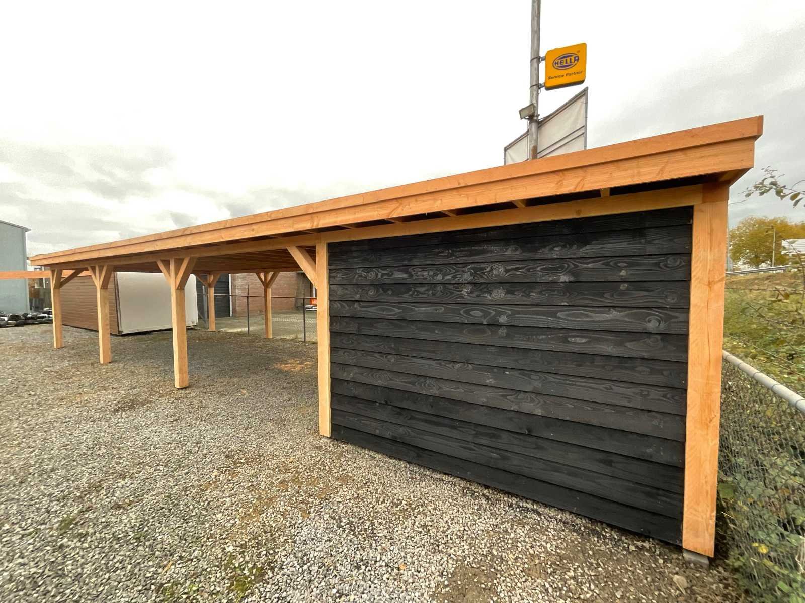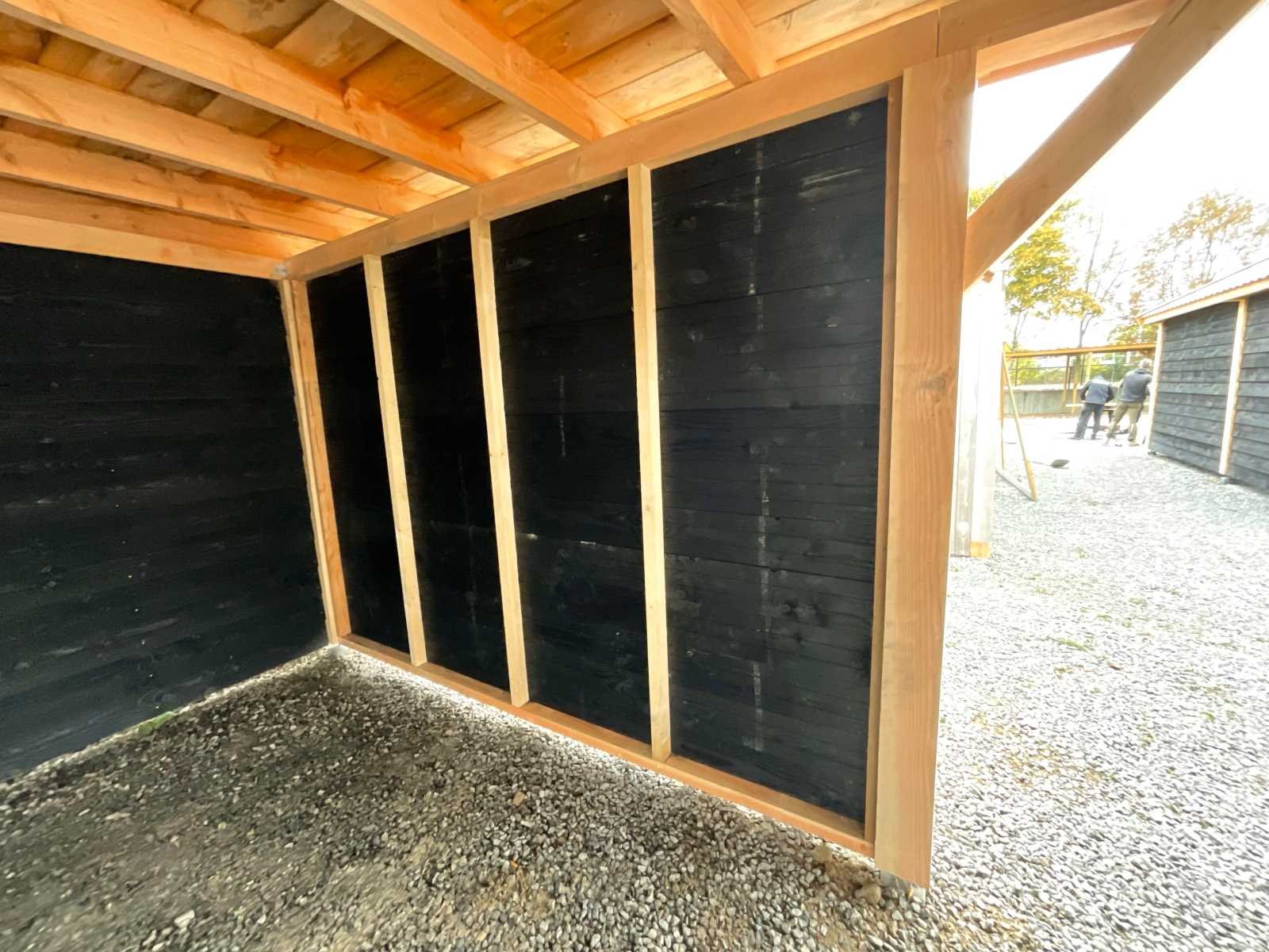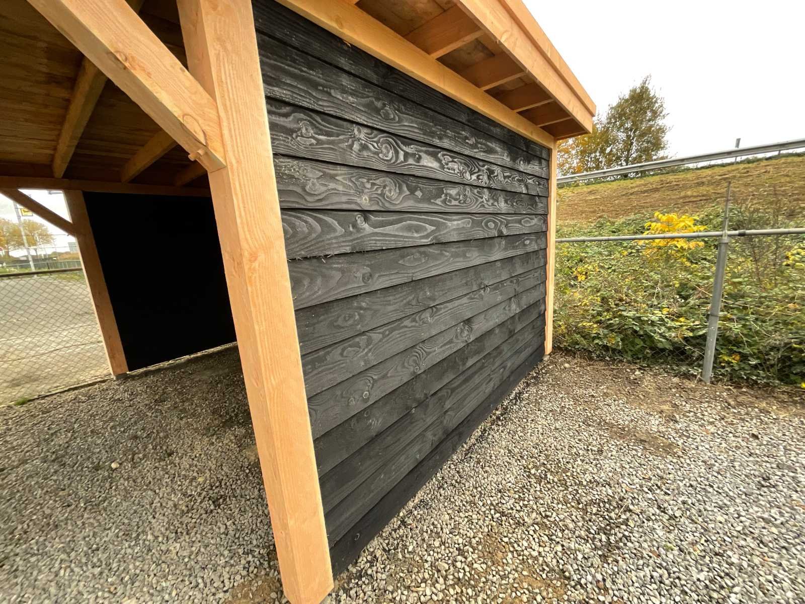 Specificaties Buitenverblijf: Palen: 150x150 mm Liggers: 120x120 mm Dakbalken: 50x150 mm Dakplanken: 18 mm dik Wanden: Zweeds rabat, zwart geïmpregneerd, bevestigd op vuren regelwerk (45x60 mm). De rabatdelen moeten bij montage nog op maat worden gezaagd. Het buitenverblijf wordt geleverd als bouwpakket, op maat gezaagd, inclusief bevestigingsmateriaal en een handleiding. Afmeting: 1800x500 cm (buitenmaat dakrand) Berging: Drie zijden dicht, totale afmeting 300x400 cm Aantal palen: 14 stuks Dakbedekking en paalhouders: Niet inbegrepen Hoogte: Doorloophoogte: 225 cm Totale hoogte: 257 cm Breedte en diepte: De opgegeven maat betreft de dakmaat. Dakoversteek: Links, rechts en voorzijde: 30 cm Achterzijde: Geen oversteek Afmetingen pakket: 125x500x140 cm (BxLxH) Gewicht: 2500 kg Model: Vrijstaand Gewicht: 2500kg Lengte: 1800cm Breedte: 500cm Hoogte: 257cm Materiaal: Douglas