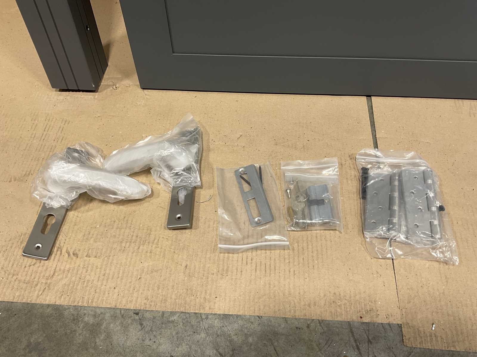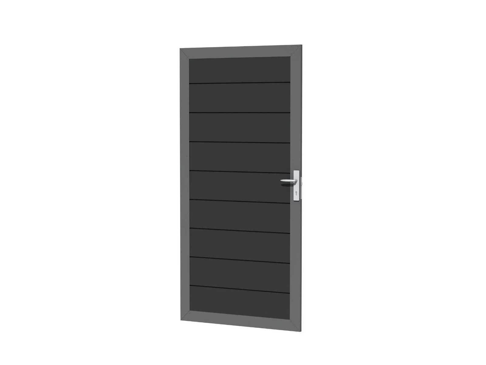 Kavel bevat: 1x aluminium deur in aluminium frame (183 x 90 cm) 1x set hang- en sluitwerk Let op: Palen worden niet meegeleverd. Kleur: Antraciet