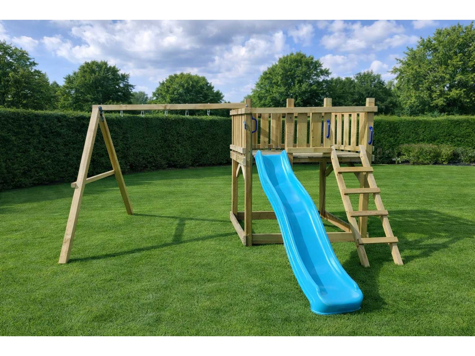 Speeltoren Robusto met een vloerhoogte van 125 cm. Gemaakt van stevige palen en schommel van 88x88 mm en voorzien van een kunststof glijbaan in de kleur blauw. Wordt geleverd inclusief 2 handgrepen, 4 schommelhaken, 1 grondanker voor het verankeren van de schommelpalen, bevestigingsmateriaal en montagehandleiding. Deze speeltoren wordt geleverd als bouwpakket. Afmetingen pakket: 80x50x240cm, 575kg. Model: vrijstaand Product type: robusto Gewicht: 575kg Lengte: 410cm Breedte: 300cm Hoogte: 200cm Materiaal: grenen geïmpregneerd