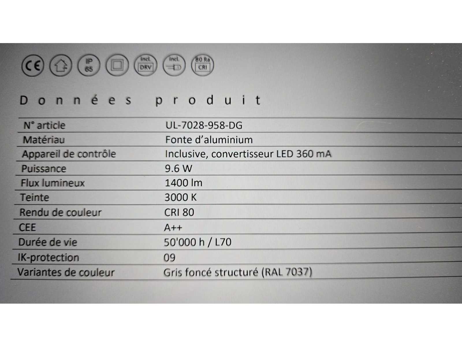 Hoge kwaliteit buitenverlichting Ongebruikt in de verpakking Zie foto's voor de details Merk: Unilamp Model: wandlamp outdoor Product type: 7028-0-3-958-03 Met lichtbron: true Energielabel: A Wattage: 9,6W Lichtbron: LED Kleur: Grijs Lengte: 34cm Breedte: 21cm Hoogte: 8cm Materiaal: Metaal