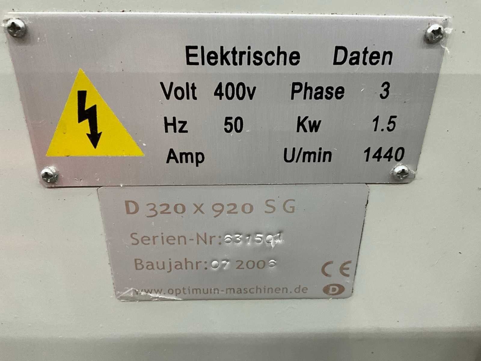 Merk: Optimum Type: D 320x920SG Bouwjaar: 2006 Serienummer: 631502 Aansluiting: 400V Afmeting l: 1700mm Afmeting b: 750mm Afmeting h: 1300mm