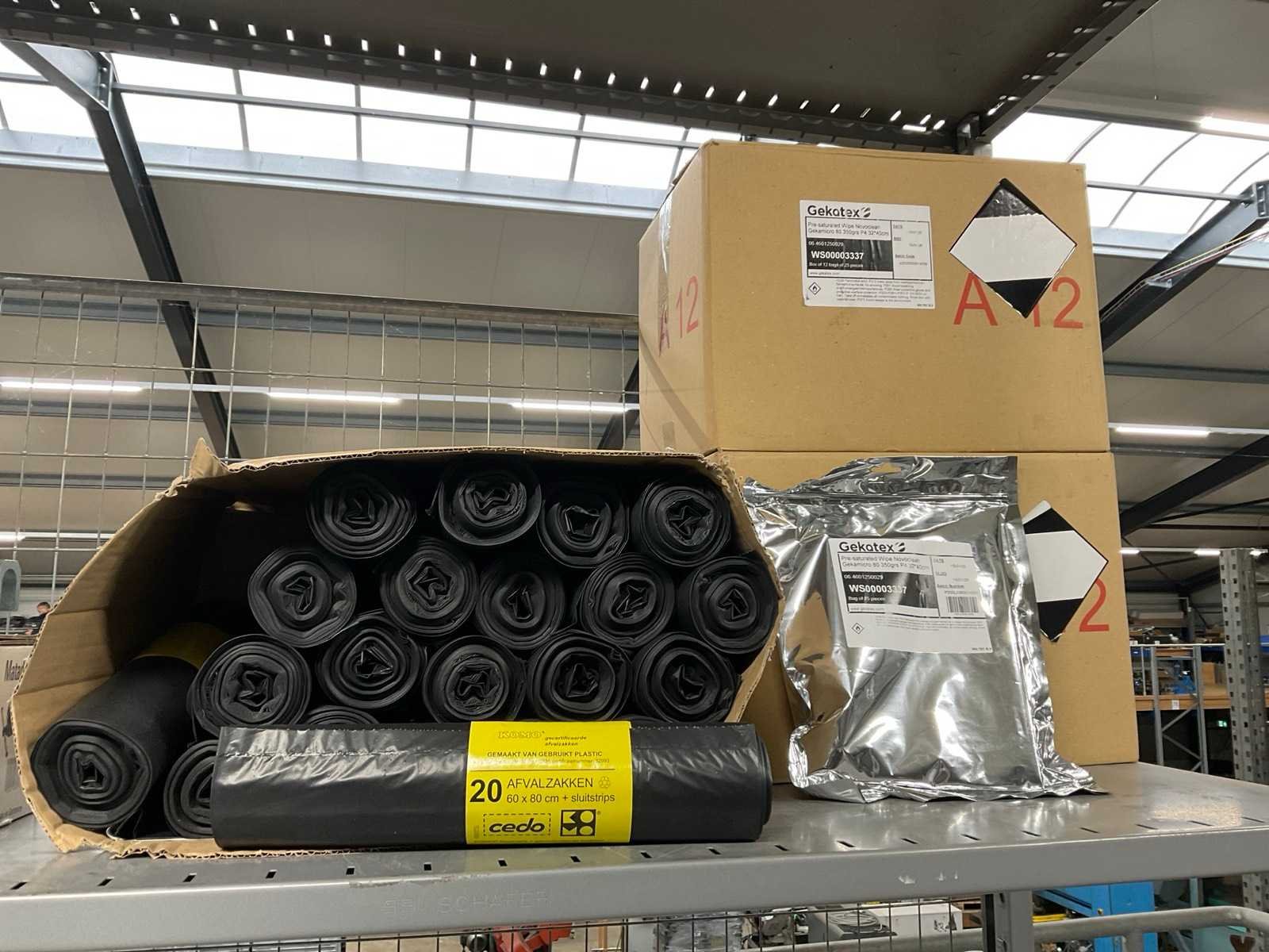 1e: 2x Doos Gekatex desinfectie doeken 2e: 21x rol Komo afvalzakken