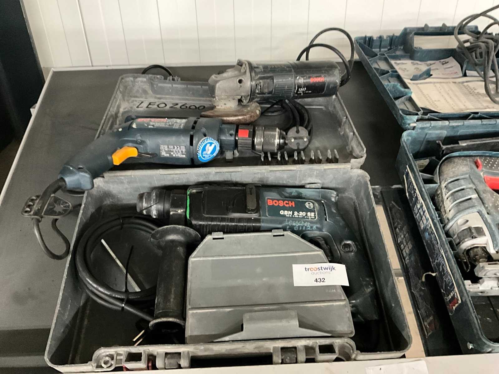 2x boormachine, 1x haakse slijper, 1x koffer. Merk: Bosch Aansluiting: 230V Met koffer: true
