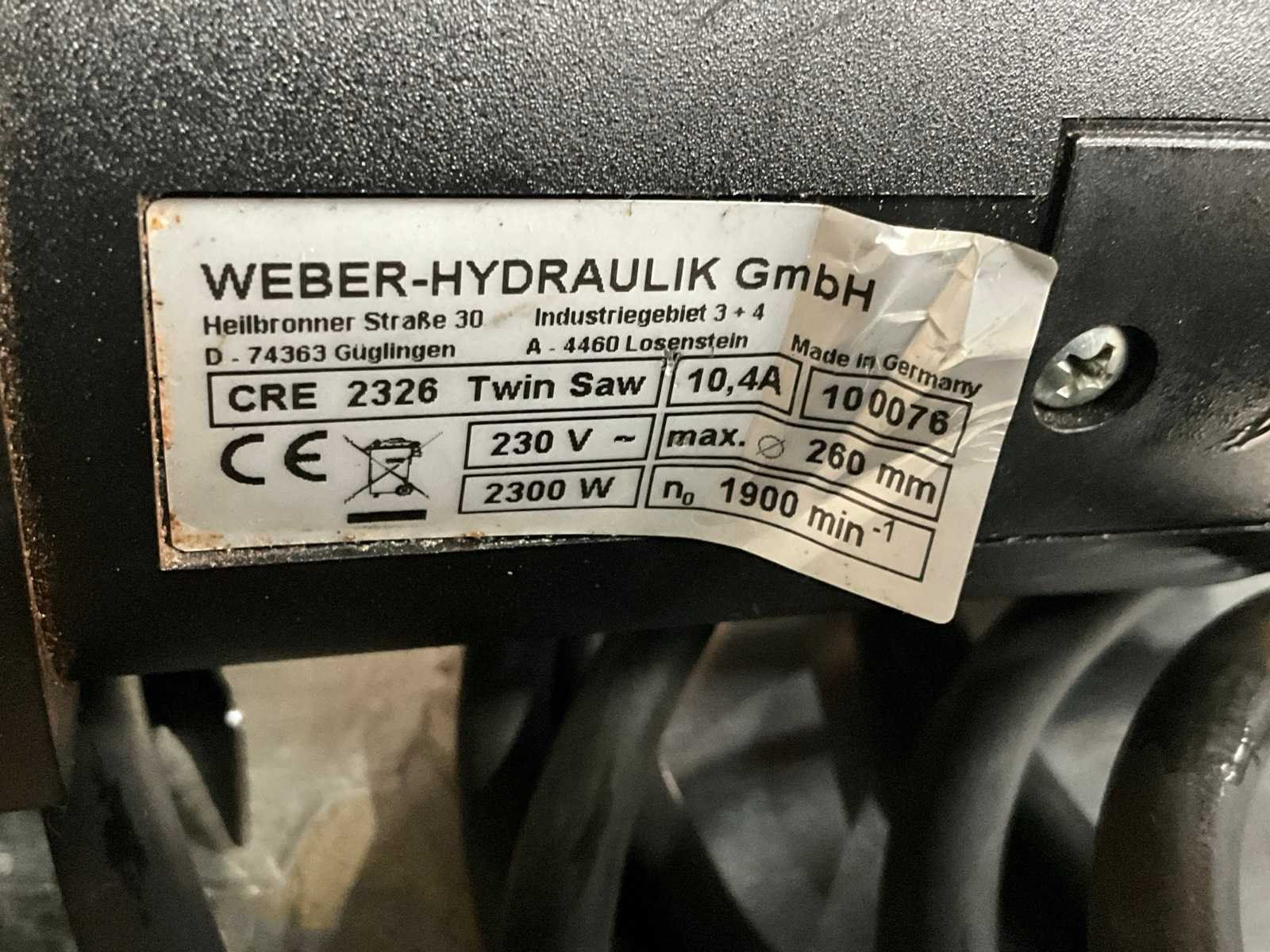 230V, 2300W, Ø 260 mm, incl. ZARGES transportkist Merk: Weber-Hydraulik Model: CRE 2326 Twin Saw