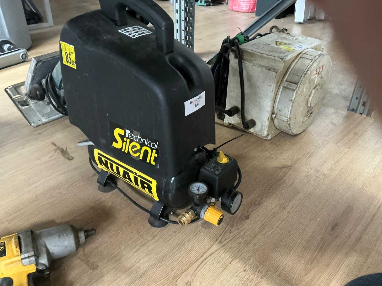 Draagbaar Merk: Nuair Type: OM200/6 SIL Bouwjaar: 2012 Serienummer: 322585 Capaciteit.: 8bar Vermogen: 0.75kW Buffertank inhoud: 6l Aansluiting: 230V