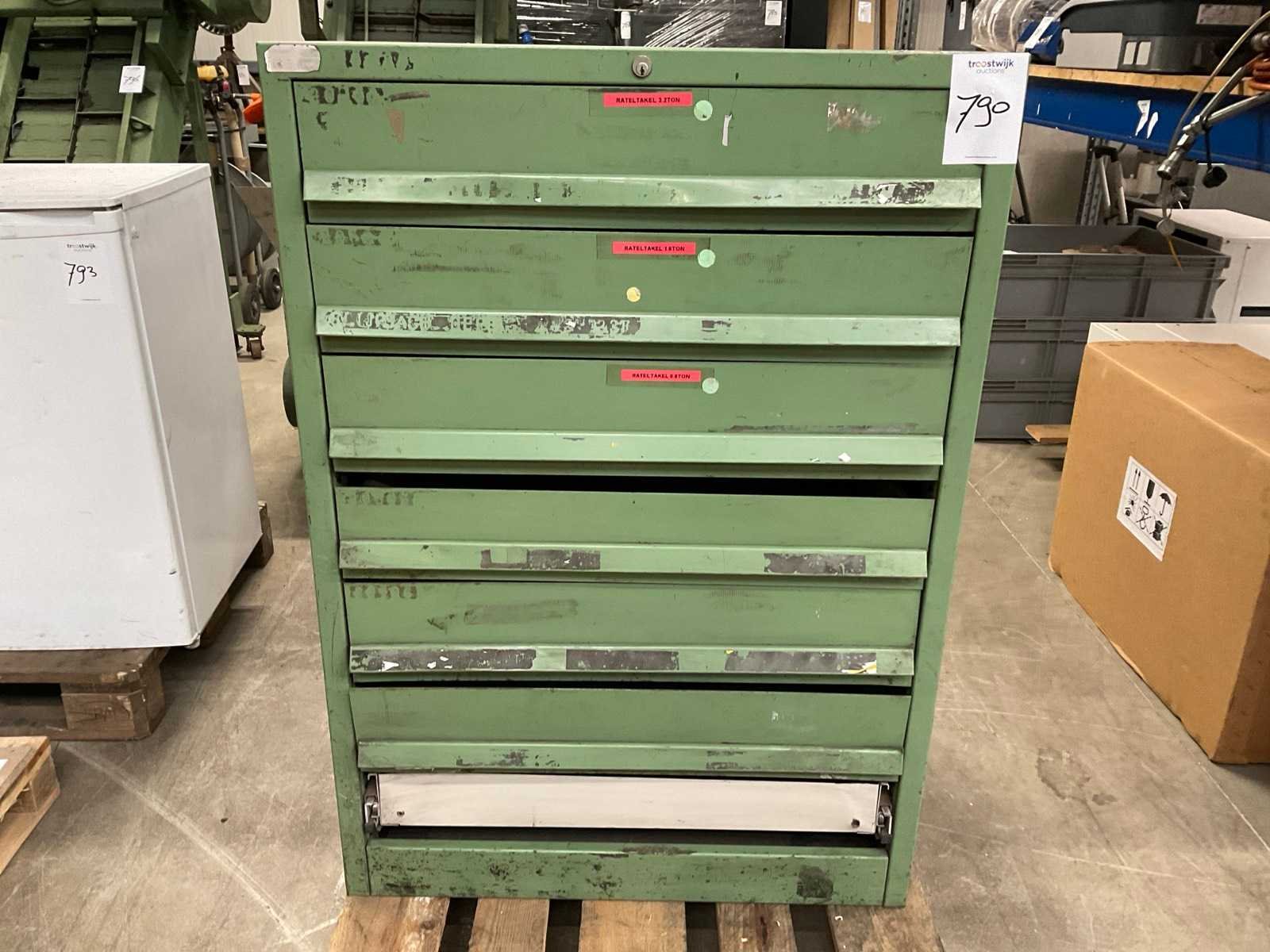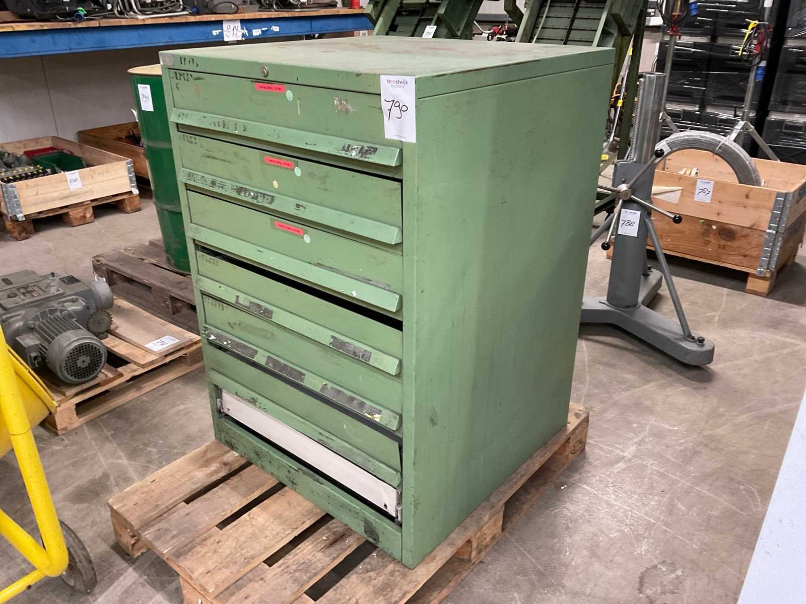 Let op! Sleutel ontbreekt. Onderste lade ontbreekt front. Pallet niet inbegrepen Aantal laden: 7 Kleur: Groen Lengte: 76 Breedte: 77cm Hoogte: 108cm Materiaal: Staal
