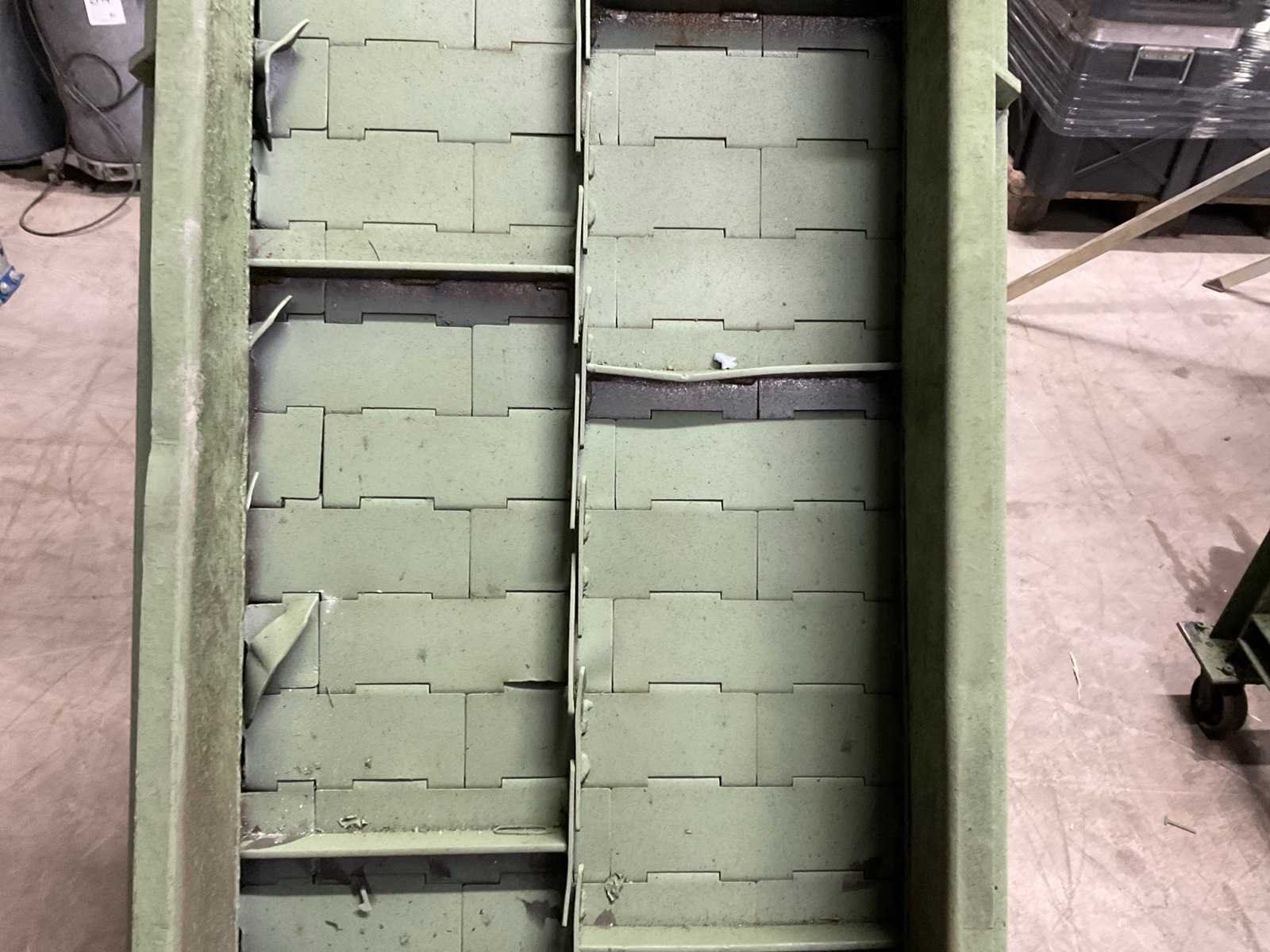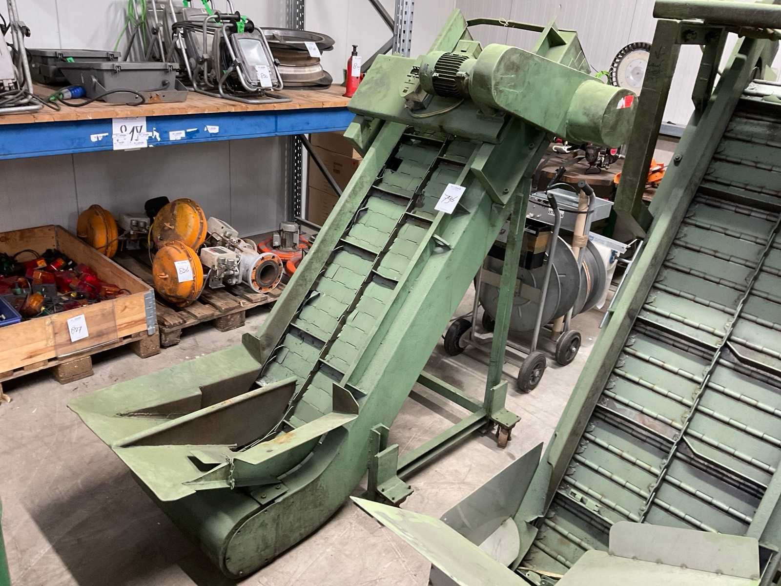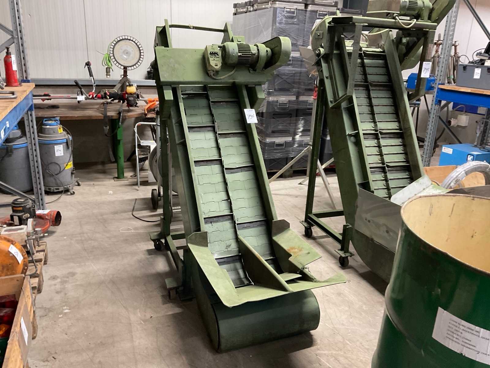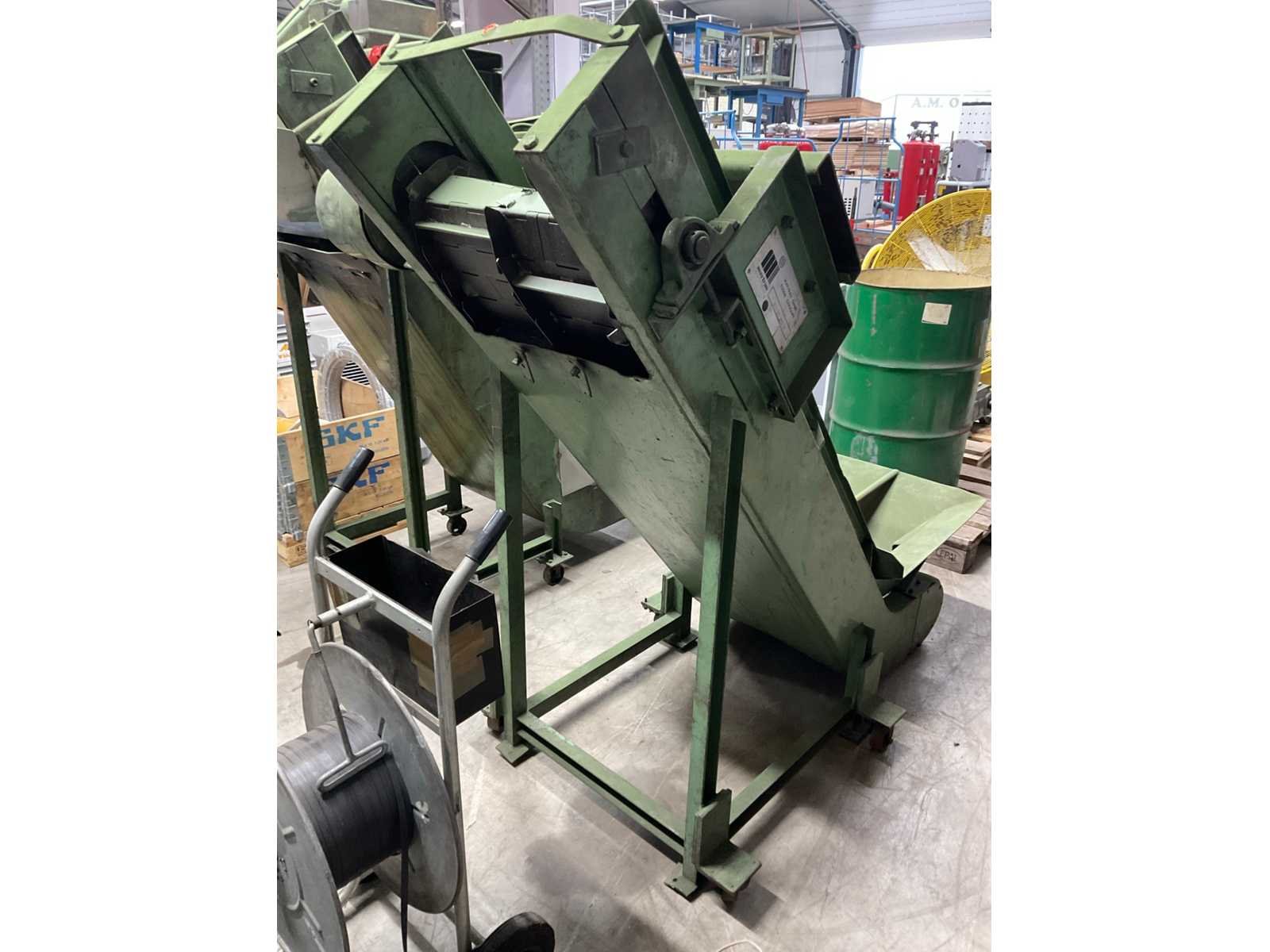 Voorzien van stalen transportband en stalen meeneemlamellen. Merk: Mayfram Aansluiting: 400V Band afm. l: 1500mm Totale afmeting Hoogte: 1700mm Band afm. b: 440mm Totale afmeting Breedte: 900mm Totale afmeting L: 1700mm