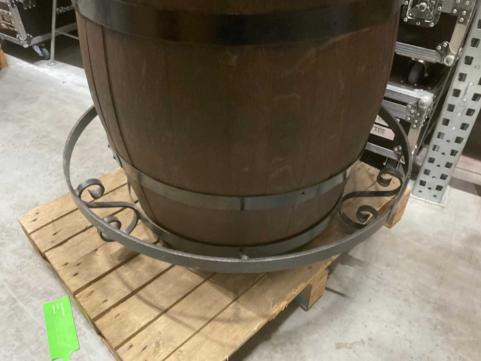 In ton-uitvoering, Houten vat met metalen sierframe en ronde voetring. Totale afmeting L: 95cm Totale afmeting Hoogte: 115cm Hout: true Metaal: true
