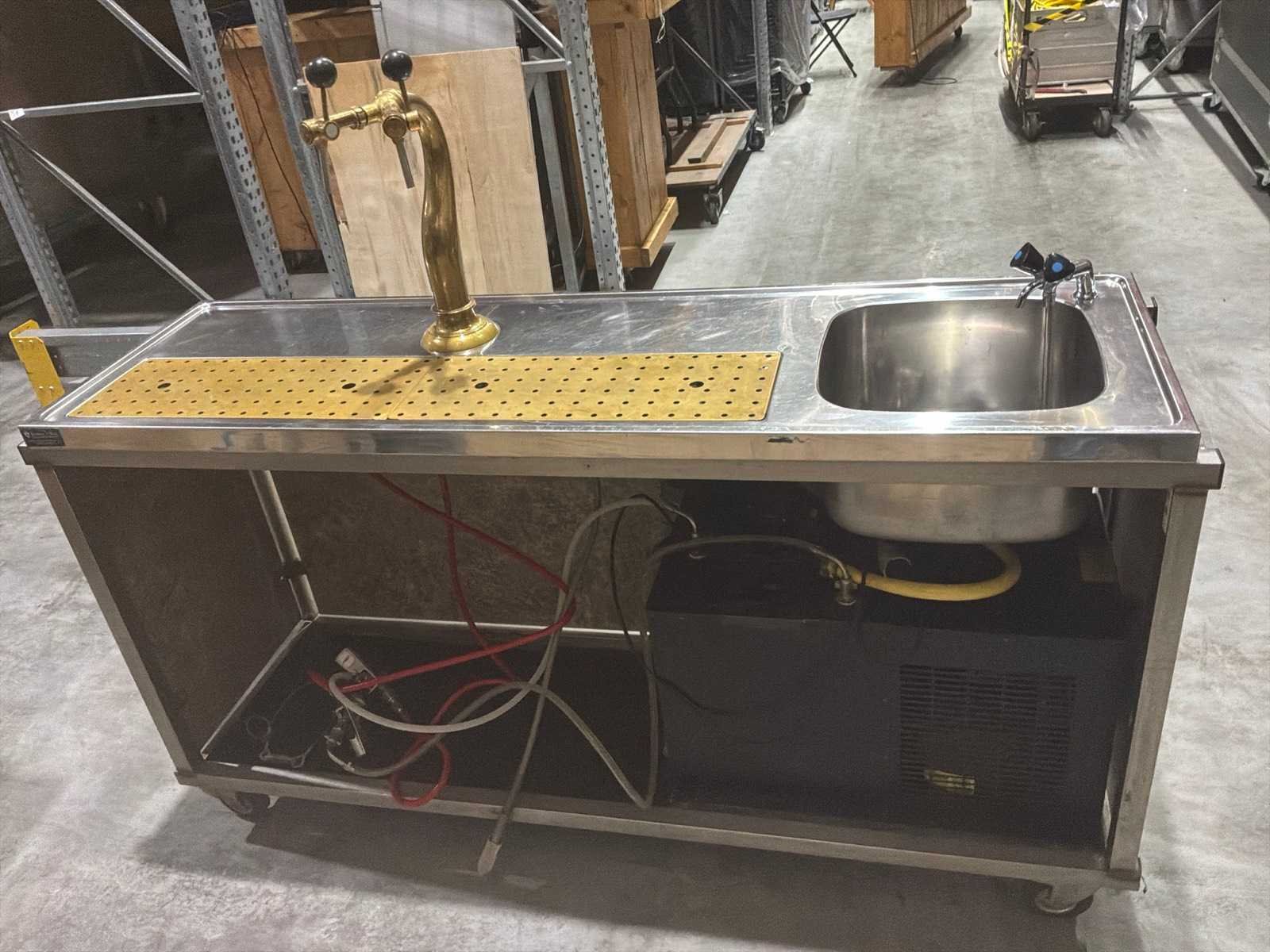 Voorzien van: dubbele biertap, waterkoeler, wasbak. Koolzuurmeter & ontluchter defect. Kleur: Wit Lengte: 55cm Breedte: 186cm Hoogte: 150cm Materiaal: Roestvrijstaal