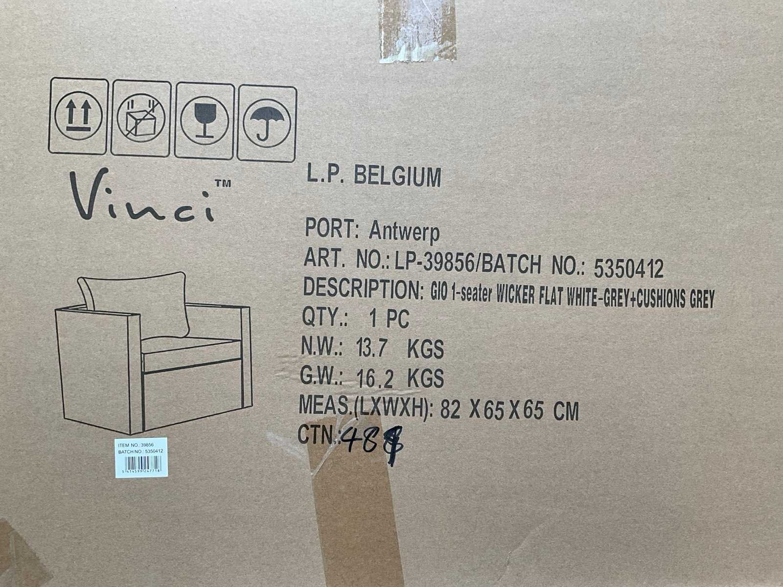 Inclusief kussens; Nieuw in doos Merk: Vinci Model: Lounge-stoel Product type: 1-zits Kleur: Grey