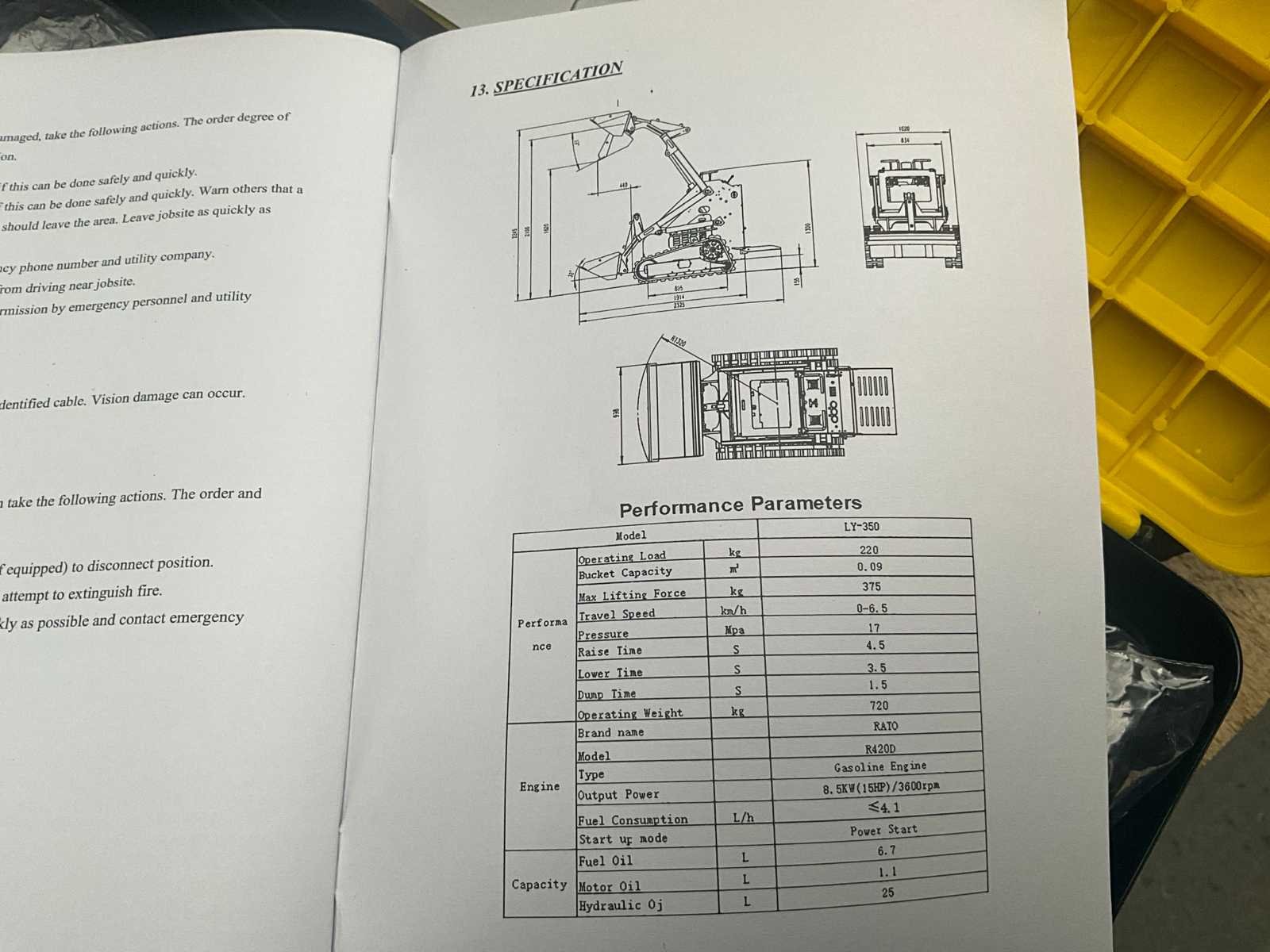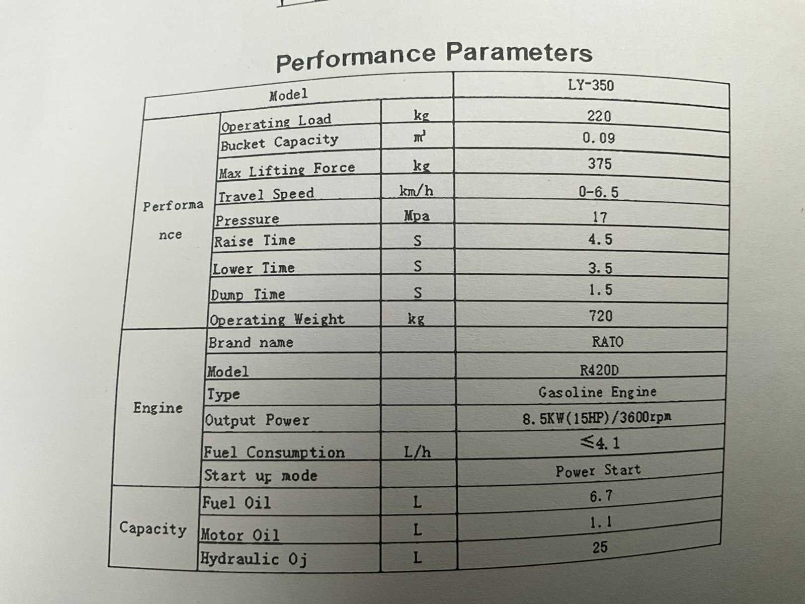 Voorzien van extra hydraulische functies; motorvermogen 8,5 KW 15 pk; elektrische start; verlichting; mechanische snel wissel; max hefhoogte 2245 mm; ongebruikt Merk: HH Type: LY-350 Bouwjaar: 2025 Merk motor: Rato Motorvermogen (kW): 8,5kW Aantal cilinders: 1 Brandstof: Benzine Graafbak afm. l: 640mm Graafbak afm. b: 1000mm Graafbak afm. h: 350mm Eigen gewicht: 720kg Totale afmeting L: 2350mm Totale afmeting Breedte: 1020mm Totale afmeting Hoogte: 1400mm