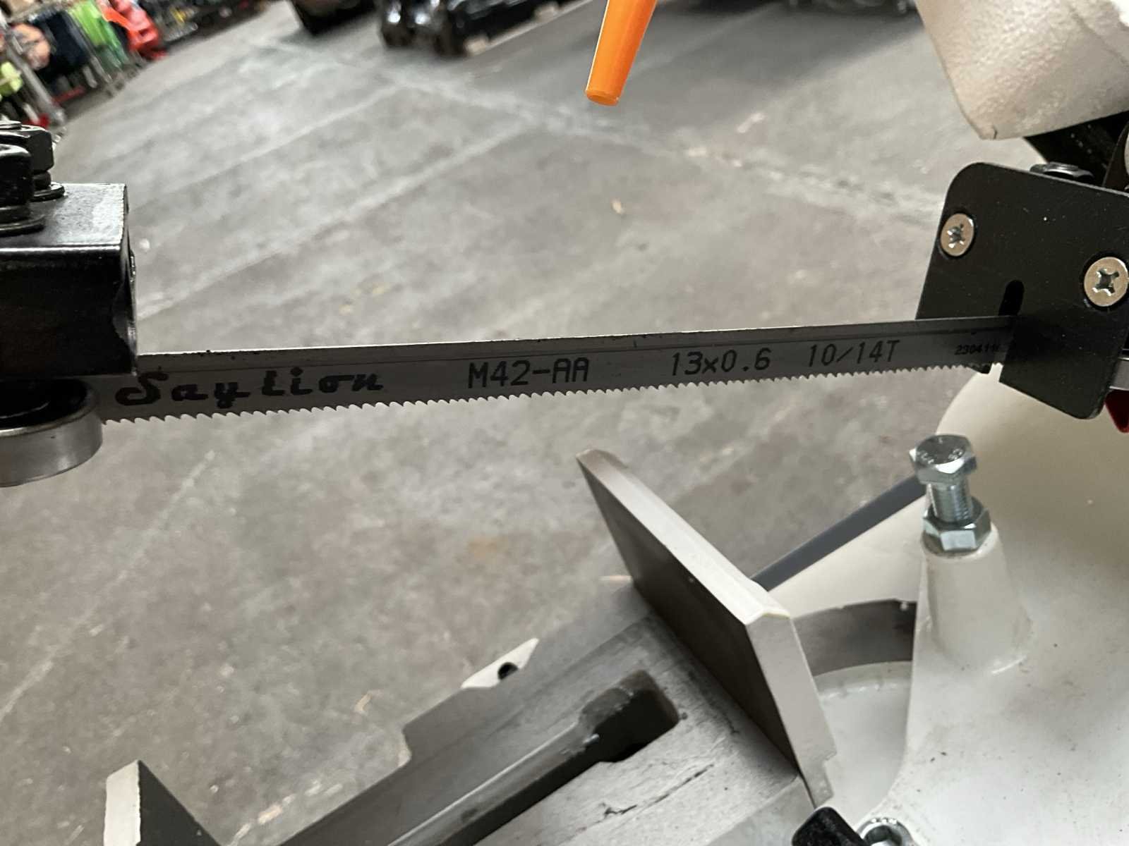 Verstelbare onder hoek max. 60 gr; noodstop; handleiding aanwezig; max klembereik 165 mm; voorzien van koelvloeistof pomp Merk: HH Type: G5013W Bouwjaar: 2024 Zaagblad afm. l: 1638mm Zaagblad afm. b: 13mm Zaagbladdikte: 0.60mm Aantal snelheden: 3 Aansluiting: 220V Afmeting l: 950mm Afmeting b: 500mm Afmeting h: 1200mm
