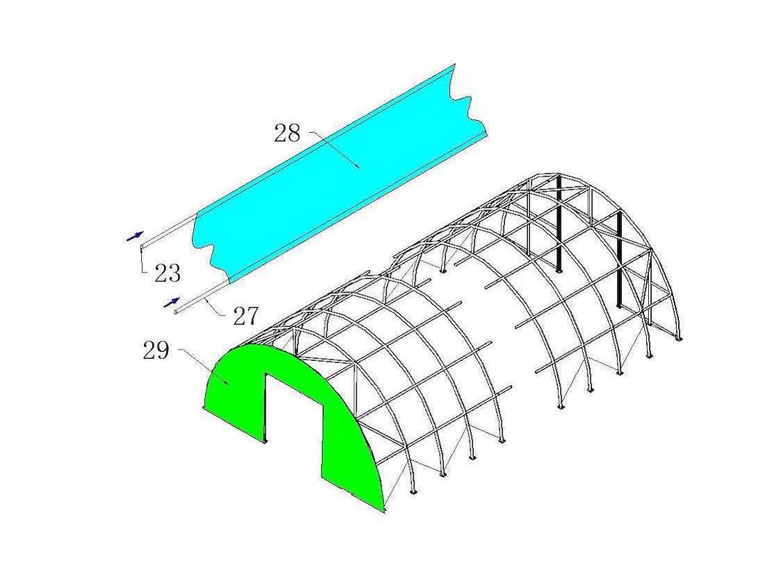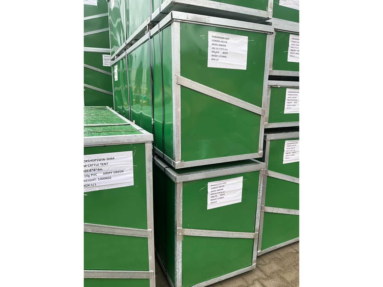 Opslagtent / garage; v.v. buizensysteem; gegalvaniseerd Ruimte tussen bogen 2400 mm Maat boog Φ 56x86x2 mm Maat gording Φ 48x1,5 mm; deur (afm. 396x451 cm); materiaal 420 gram PVC; kleur wit; inclusief montage handleiding; ongebruikt in 2 metalen kisten Zie voor meer info downloads; Transportafmeting metalen krat: 2950x750x1000 mm (lxbxh) Merk: Easy-Going Type: (24x12,20x6,10 meter) Bouwjaar: 2025 Eigen gewicht: 2240kg Totale afmeting L: 24000mm Totale afmeting Breedte: 12100mm Totale afmeting Hoogte: 6100mm GS Code: 63062200
