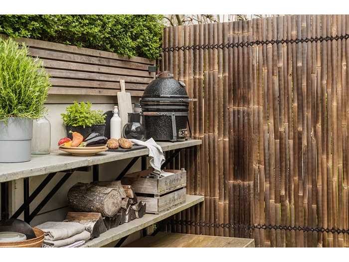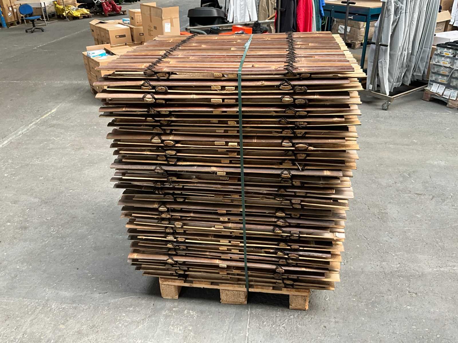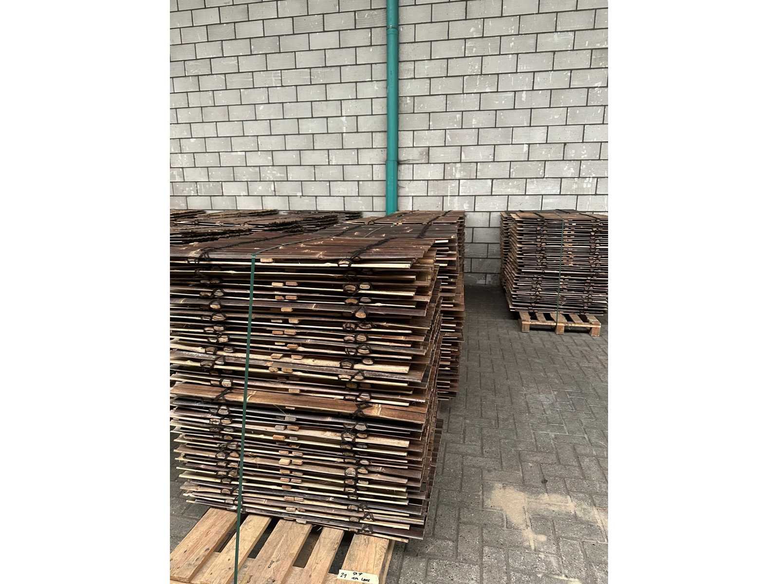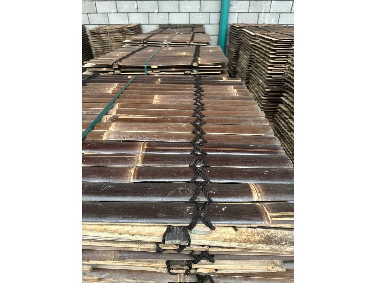Materiaal: Bamboe Categorie: Bamboe Schuttingen Bamboesoort: Java Latijnse naam: Gigantochloa atroviolacea Herkomst: Indonesië Kleur: Bruin Breedte bamboelatten: 30-50 mm Zichtdichtheid: 85% Dikte: 20 mm Breedte: 900 mm Hoogte: Divers Afwerking: Ongelakt Levensduur: 5 - 15 jaar Aantal is ca. Merk: Bamboo Model: Schutting latten Donker - Java Product type: 900x1000 mm (45 m2) = 1 pallet Kleur: donkerbruin Breedte: 90cm Hoogte: 100cm Materiaal: Bamboe