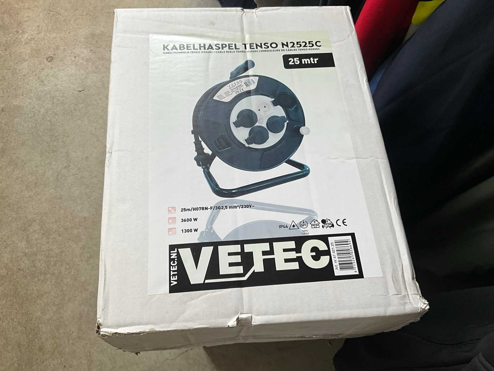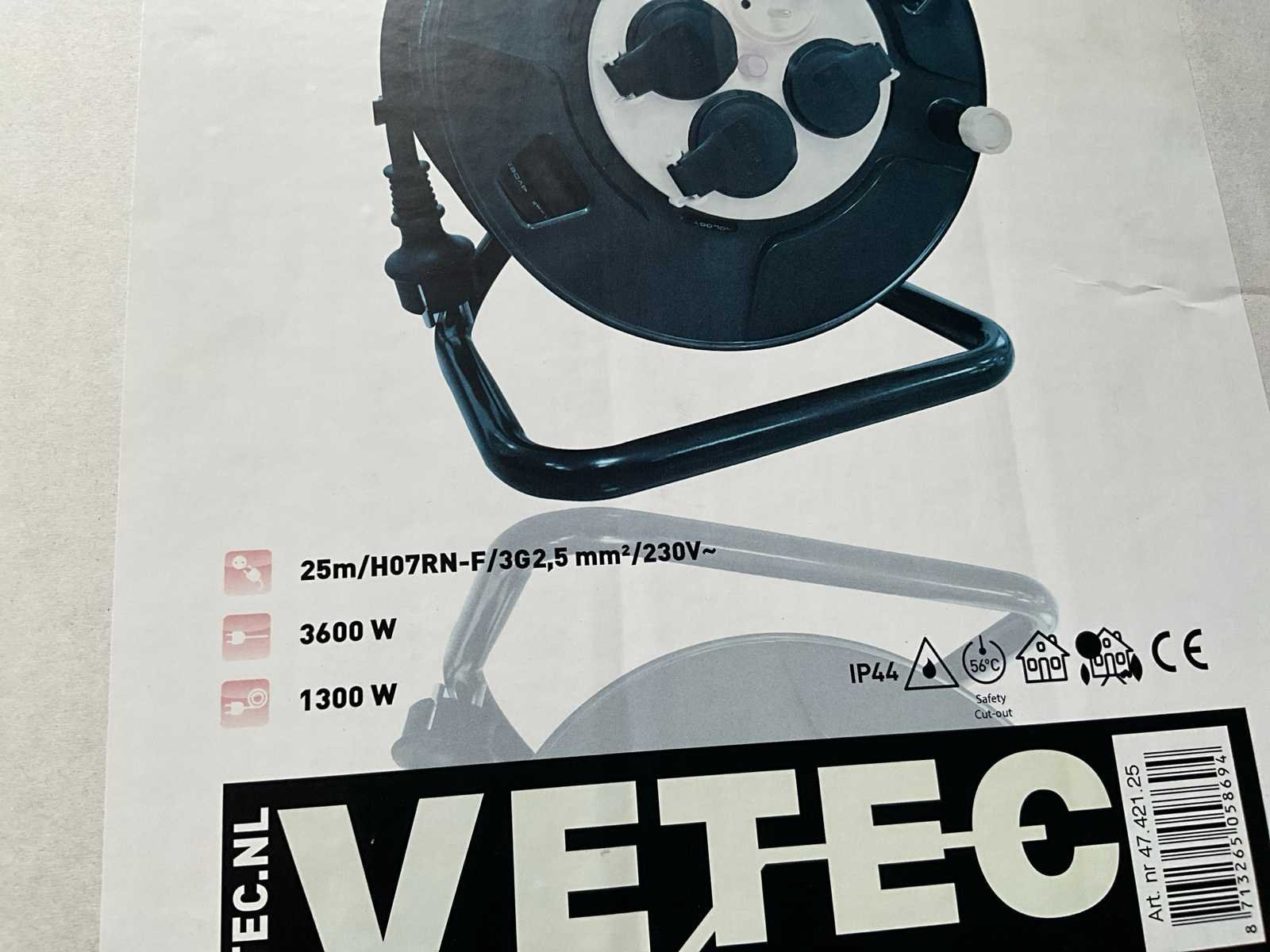 Nieuw in doos Merk VETEC Belasting op/afgerold 13000 / 3600 W TypeTenso Tenso BeveiligingThermische beveiliging TrommelKunststof Aders / doorsnede 3 G 2,5 mm² Kabellengte 25 mtr Contactdozen4 x Schuko - 230 V KabelsoortH07RN-F (neopreen) BeschermingsgraadIP 44 StekkerplaatNiet-meedraaiend ContactstopSchuko 2P+A Spanning 230V Gewicht 5,1 kg Merk: Vetec Type: Tenso N2525C - 25 mtr - 3G x 2,5 mm2 Aansluiting: 230V Lengte: 25m