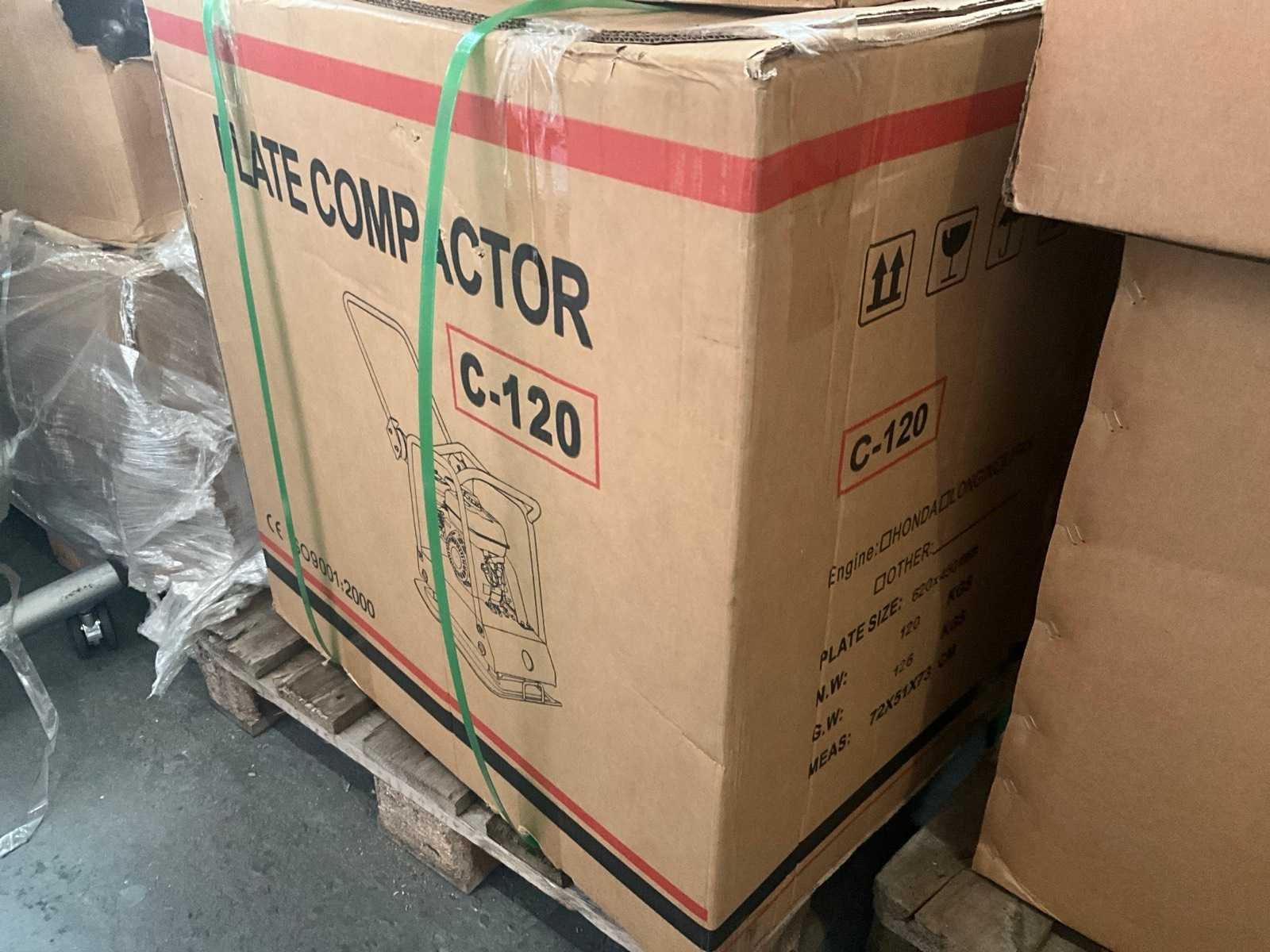 Trilplaat met benzinemotor C-120 4200 vpm snelheid 25 cm/s slagkracht 2000 kilo per vierkante cm verdichtingsdiepte ongeveer 30 cm afmeting plaat 450 x 620 mm weegt totaal 120 kilo met rubber plaat en wielstel Verpakt in kartonnen doos afmeting: 720x510x730 mm Type: C-120 Bouwjaar: 2025 Bedrijfsgewicht: 120kg Grondplaat afm. l: 620mm Grondplaat afm. b: 450mm Brandstof: benzine Eigen gewicht: 120kg