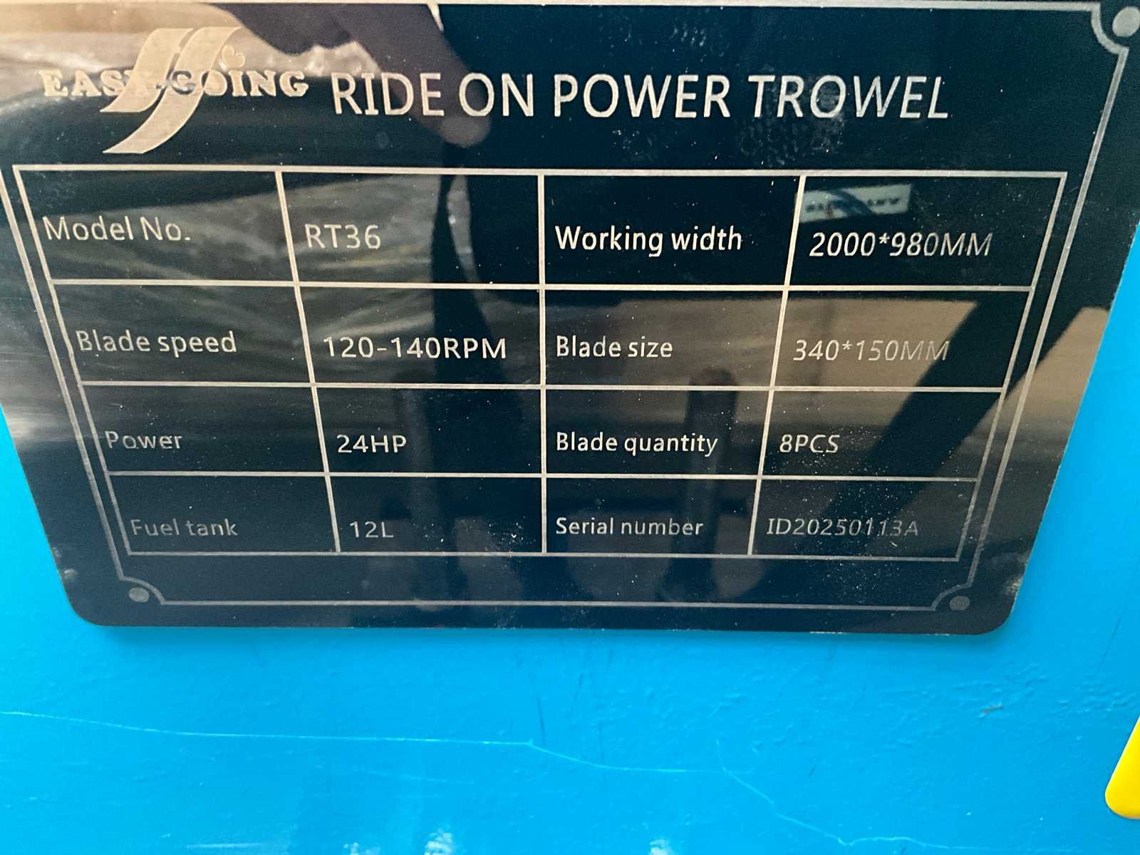 Motor: Honda GX690 (24pk) Brandstoftank: 12 liter Aantal messen: 8 stuks Aantal pannen: 2 stuks Bladsnelheid: 120 ~ 140 tpm Pansnelheid: 60 ~ 100 tpm Pandikte: 3,0 mm Werkbreedte: 2000 x 980mm Bladgrootte: 340 * 150 mm Bladdikte: 2,0 mm Gewicht: 380 kg Elektrische start; led werkverlichting; hijshaken; watertank met sproei systeem; voorzien van 2 stuks schuur schijven pannen; 8 stuks afwerkbladen; transportkar / trolley Afmeting: 1600×900×1250mm Verpakkingsgrootte: 2050x1070x1140 mm Ongebruikt. Brandstof tank en watertank zijn rood van kleur Merk: Easy-Going Type: RT36 - Honda GX690 (24 PK) Bouwjaar: 2025 Merk motor: Honda GX690 (24 pk) Eigen gewicht: 380kg Totale afmeting L: 2000mm Totale afmeting Breedte: 1100mm Totale afmeting Hoogte: 1300mm GS Code: 8479109000