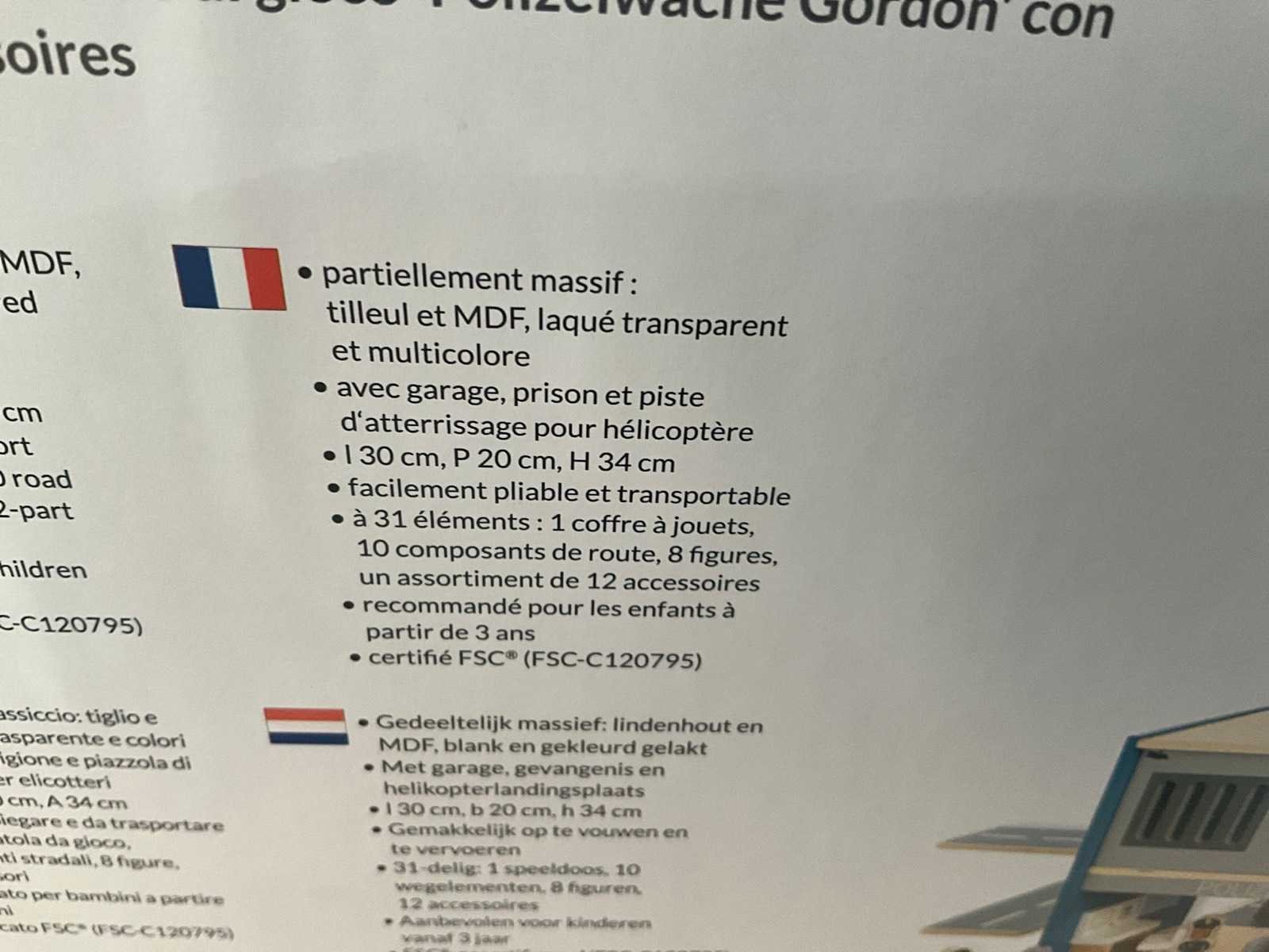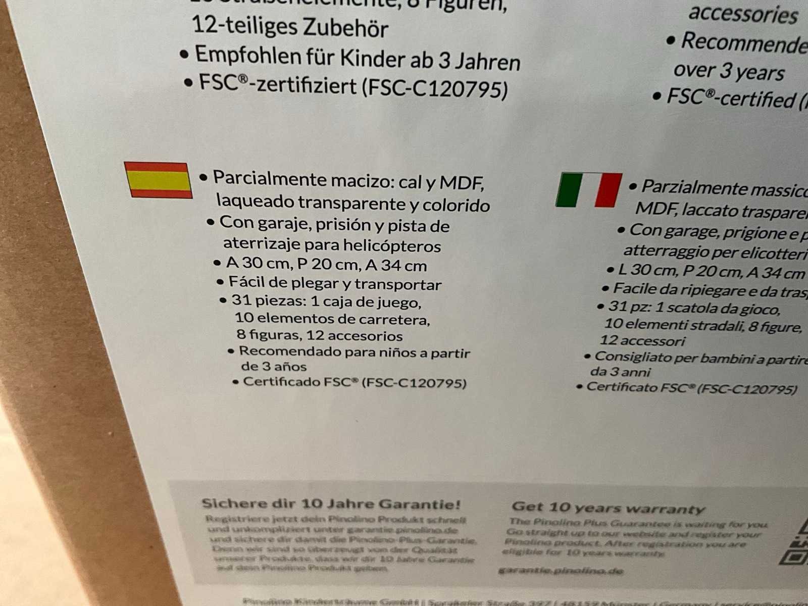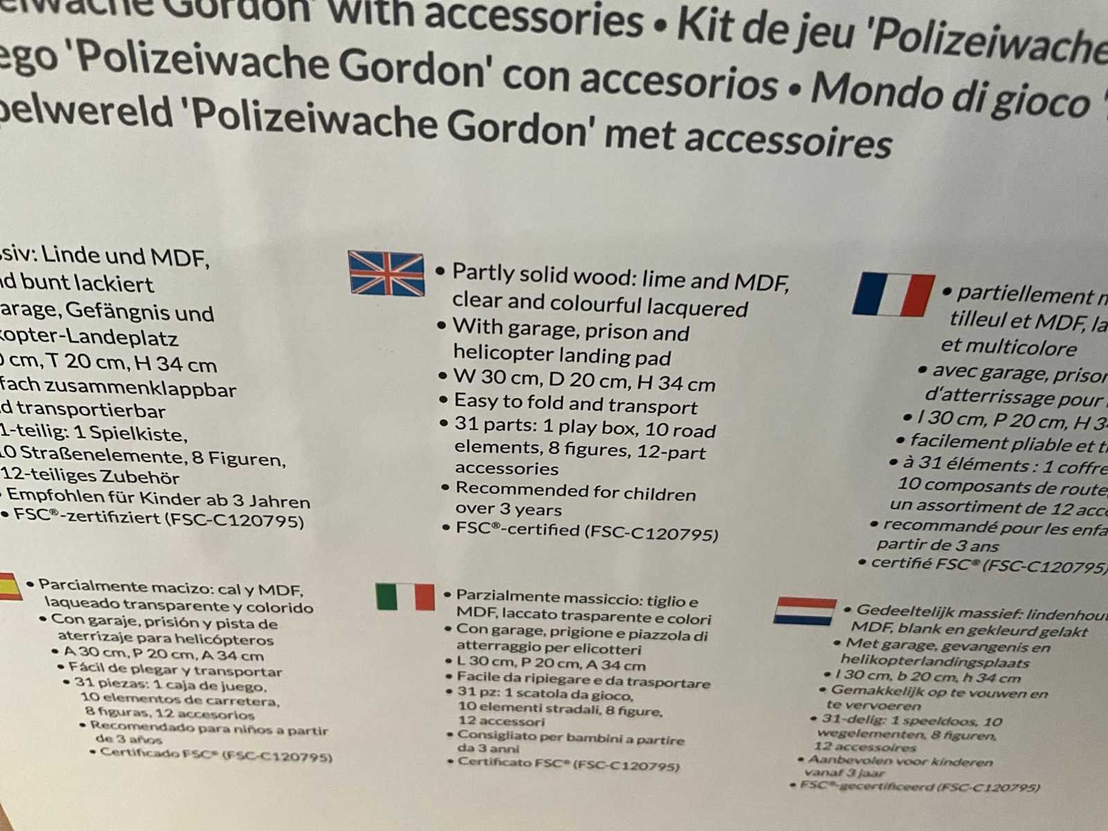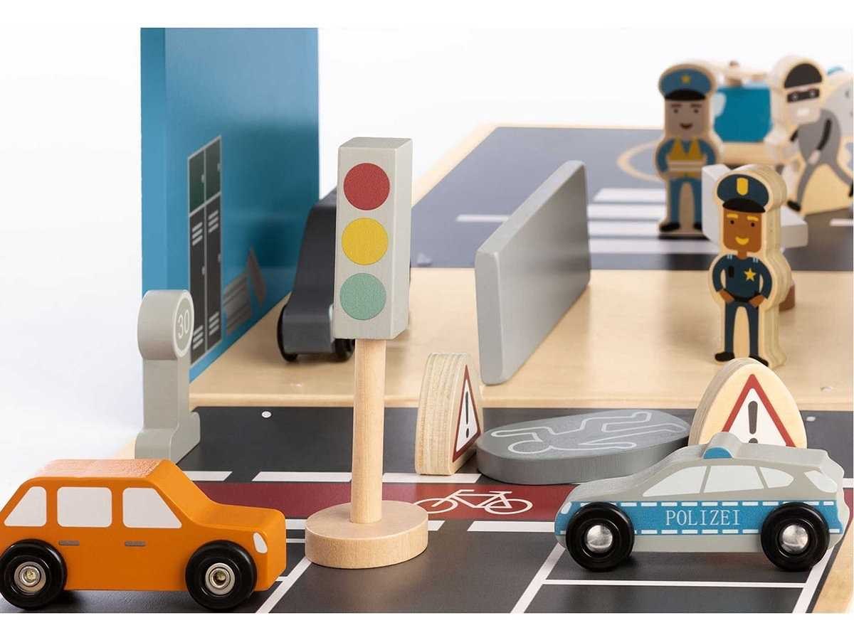 Kleine politieagenten kunnen hier volop genieten van het speelplezier: de praktische speelgoedkist, die openklapt tot een politiebureau, zit boordevol accessoires en veel blauw licht. De vele verschillende bouwmogelijkheden inspireren tot fantasierijke rollenspellen en staan garant voor spannende middagen met spannende achtervolgingen en lastige strafzaken. Kenmerken Afmetingen (B x H x D): 30 x 34 x 20 cm Materiaal: Lindehout, MDF, heldere en kleurrijke lak speciale kenmerken 2-zijdige scharnierende speelgoedkist met 30 stuks. Accessoires Comfortabele handgreep voor eenvoudig transport FSC-gecertificeerd (FSC-C120795)* Hoge speelwaarde door verschillende constructiemogelijkheden scharnierende gevangenisdeur bestuurbare auto's helikopterplatform Geen montage vereist Geschikt voor kinderen vanaf ca. 3 jaar 10 jaar fabrieksgarantie** leveringsomvang Pinolino Politiebureau Gordon Speelset De speelset bevat: Speeldoos die openklapt en een politiebureau vormt, 10x straatelementen, 8x figuren en 12-delige accessoires Verpakt in kartonnen doos 320x230x370 mm Merk: Pinolino Model: Houten politie bureau Product type: Gordon Materiaal: Mdf