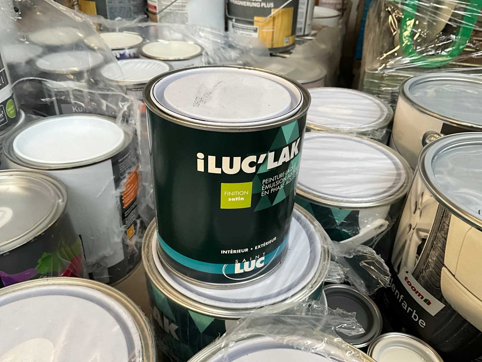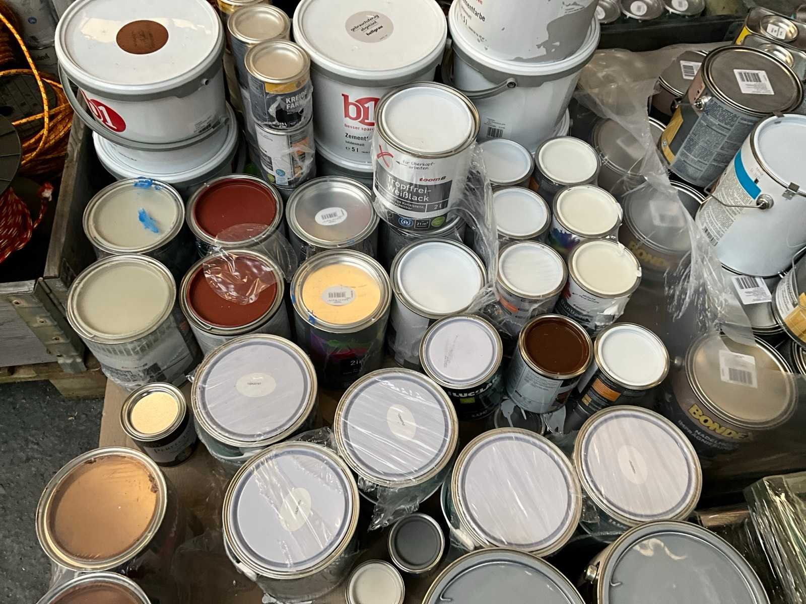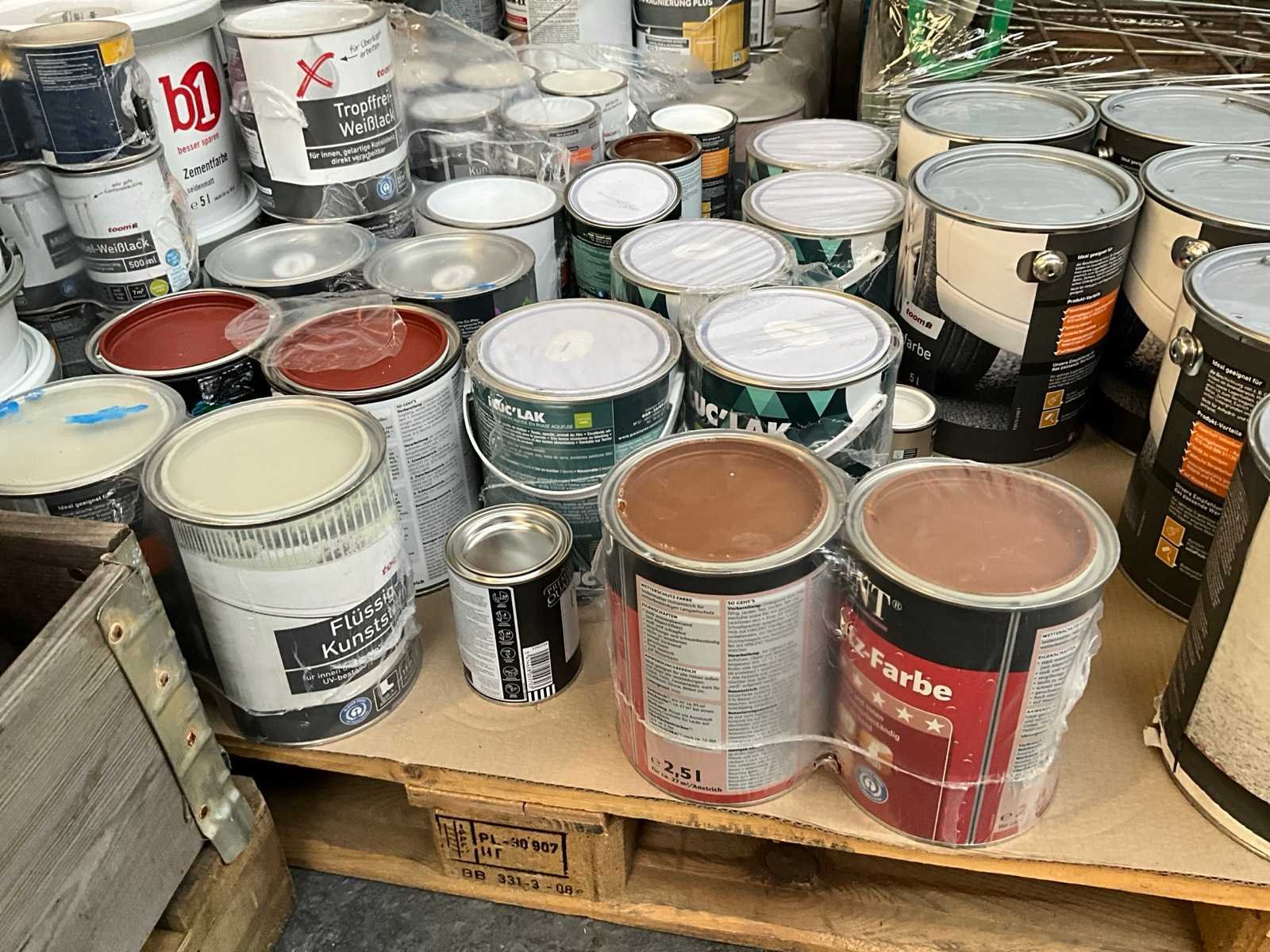 Pallet niet bij kavel inbegrepen; ongeopend met seal; nieuw; Diverse soorten, kleuren en maten verf;