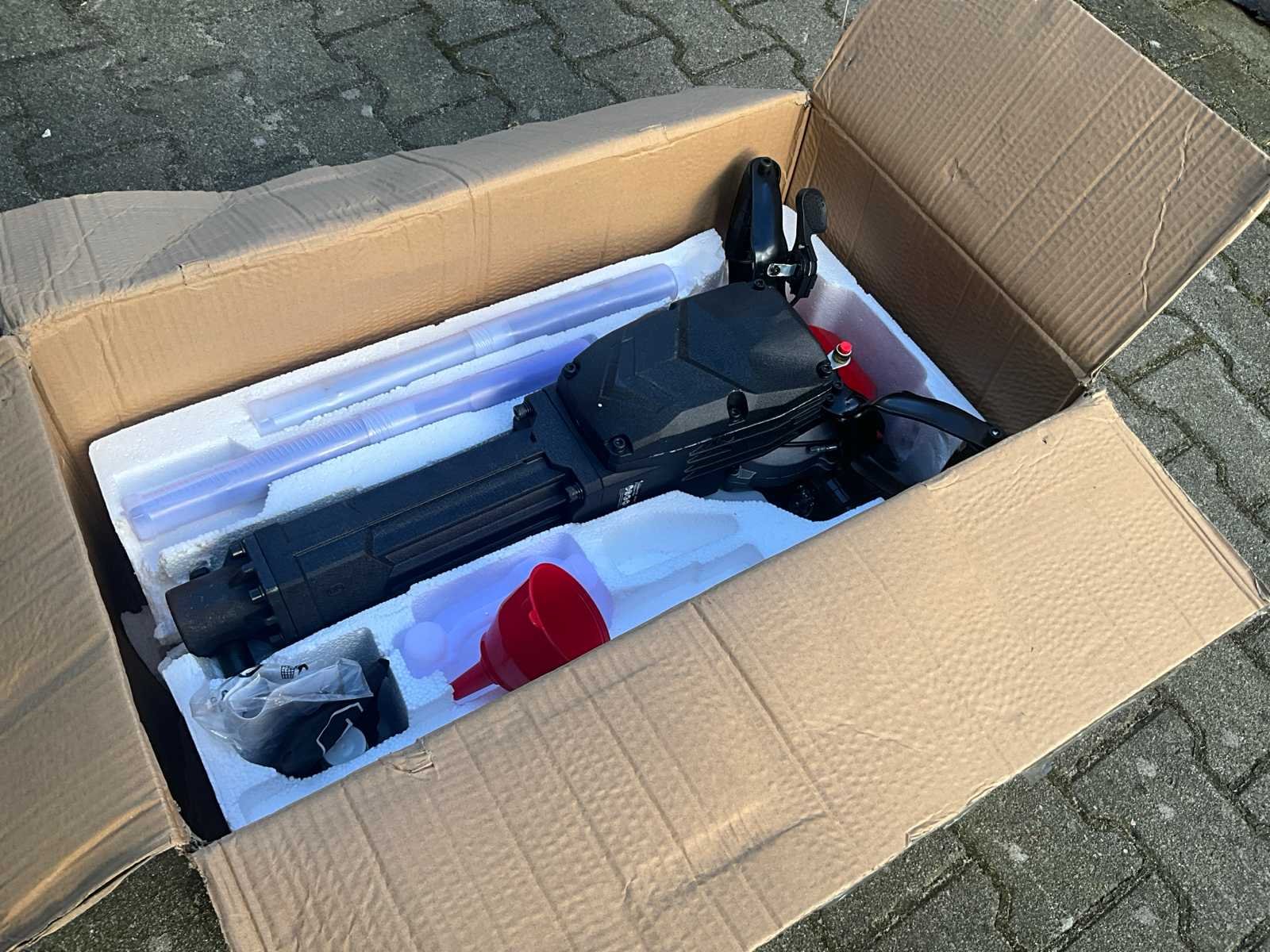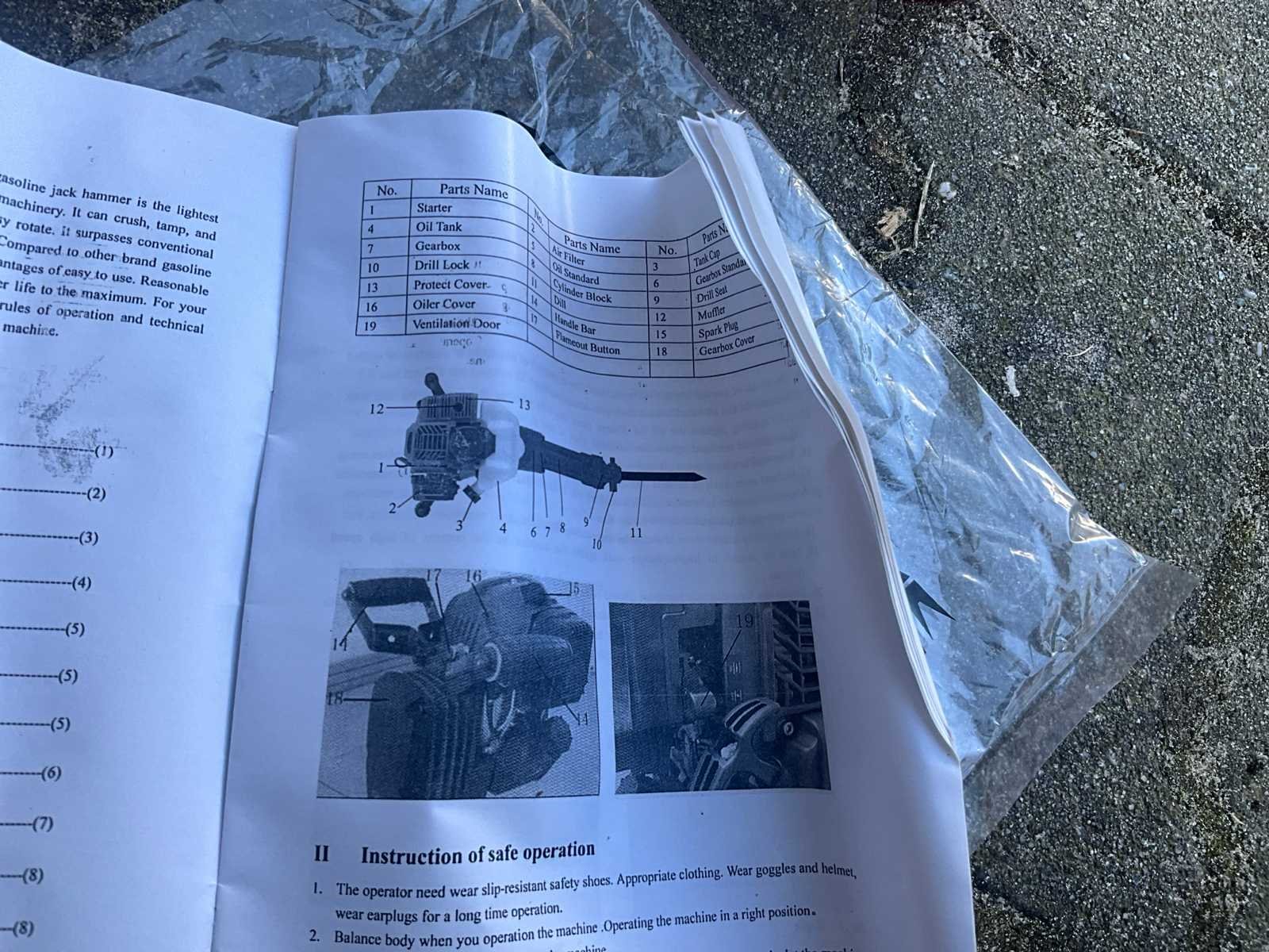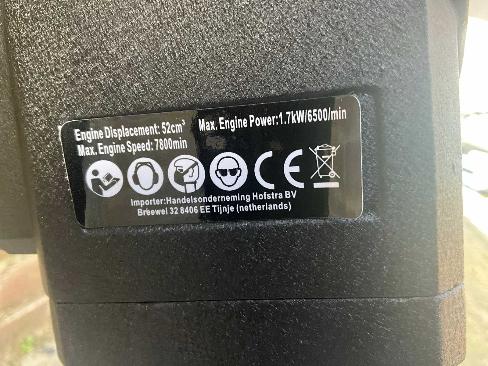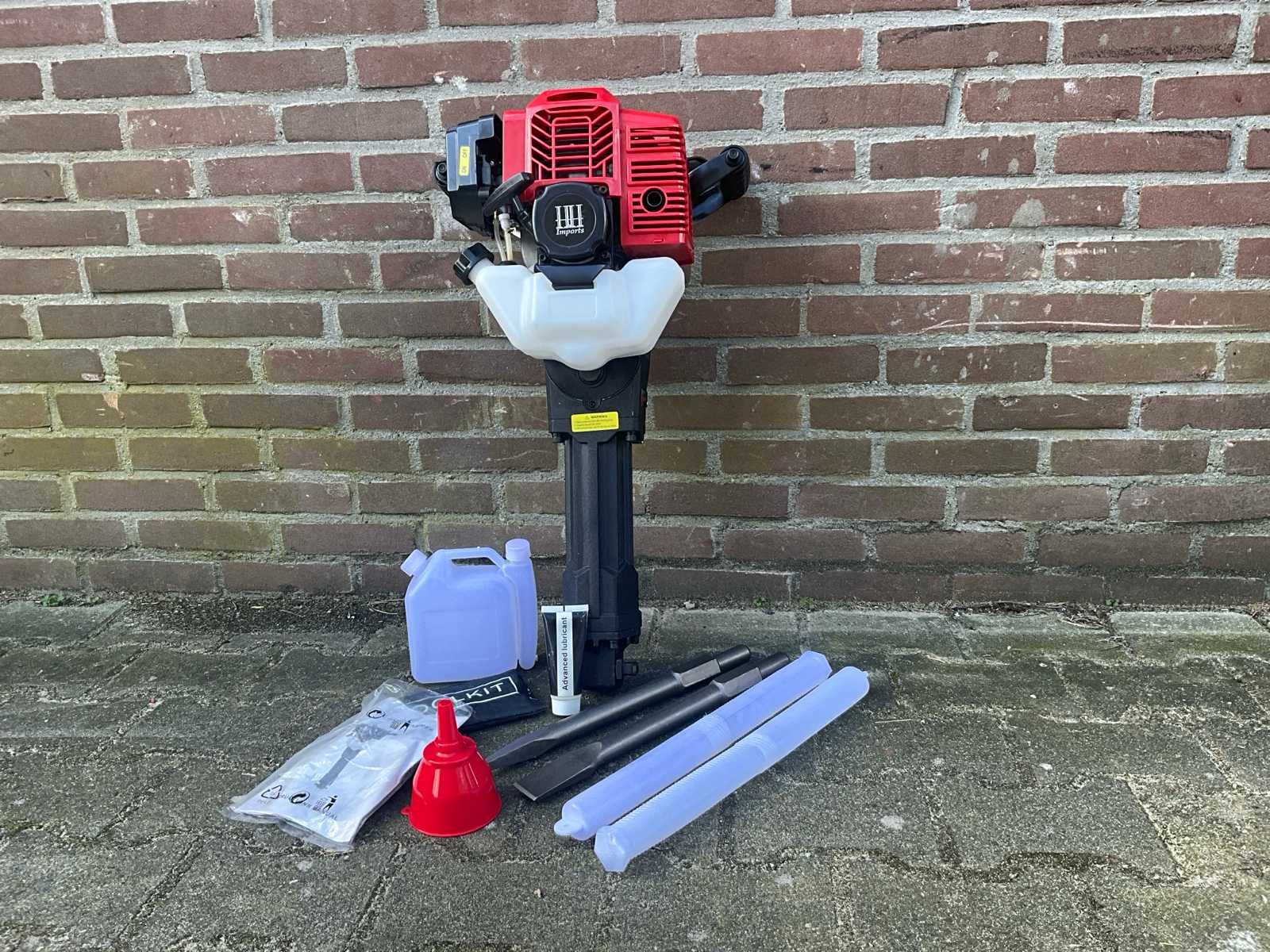 Breekhamer/sloophamer met benzine motor 52 cc Inclusief : * 1 x puntbeitel * 1 x platte beitel *1 x gereedschapskitset *1 x olievoeder *1 x handleiding Specificaties: Motortype: 44 x 34 mm, eencilinder, luchtkoeling, 2-takt Materiaal: Staal + PP Verplaatsing: 52CC Brandstof: gemengde olie (25 benzine: 1 motorolie) Inhoud brandstoftank: 1.7L Max. Kracht en snelheid: 1.8 kw / 6500r / min Max koppel en snelheid: 3,5 Nm / 5000r / min Verbruikssnelheid: ≤ 0,8L / h Slagfrequentie: 700-1500 BPM Impact Energie: 30-60J Carburateur type: H119-6A-00-210 Bougie type: BM6A Startsysteem: met de hand starten starten Afmeting van het product: 690 × 350 × 270 mm Sertification: CE Afmeting doos (LxBxH) 730mm x 390mm x 335 Merk: HH Gewicht: 24kg Vermogen: 1700W Lengte: 270mm Breedte: 350mm Hoogte: 690mm