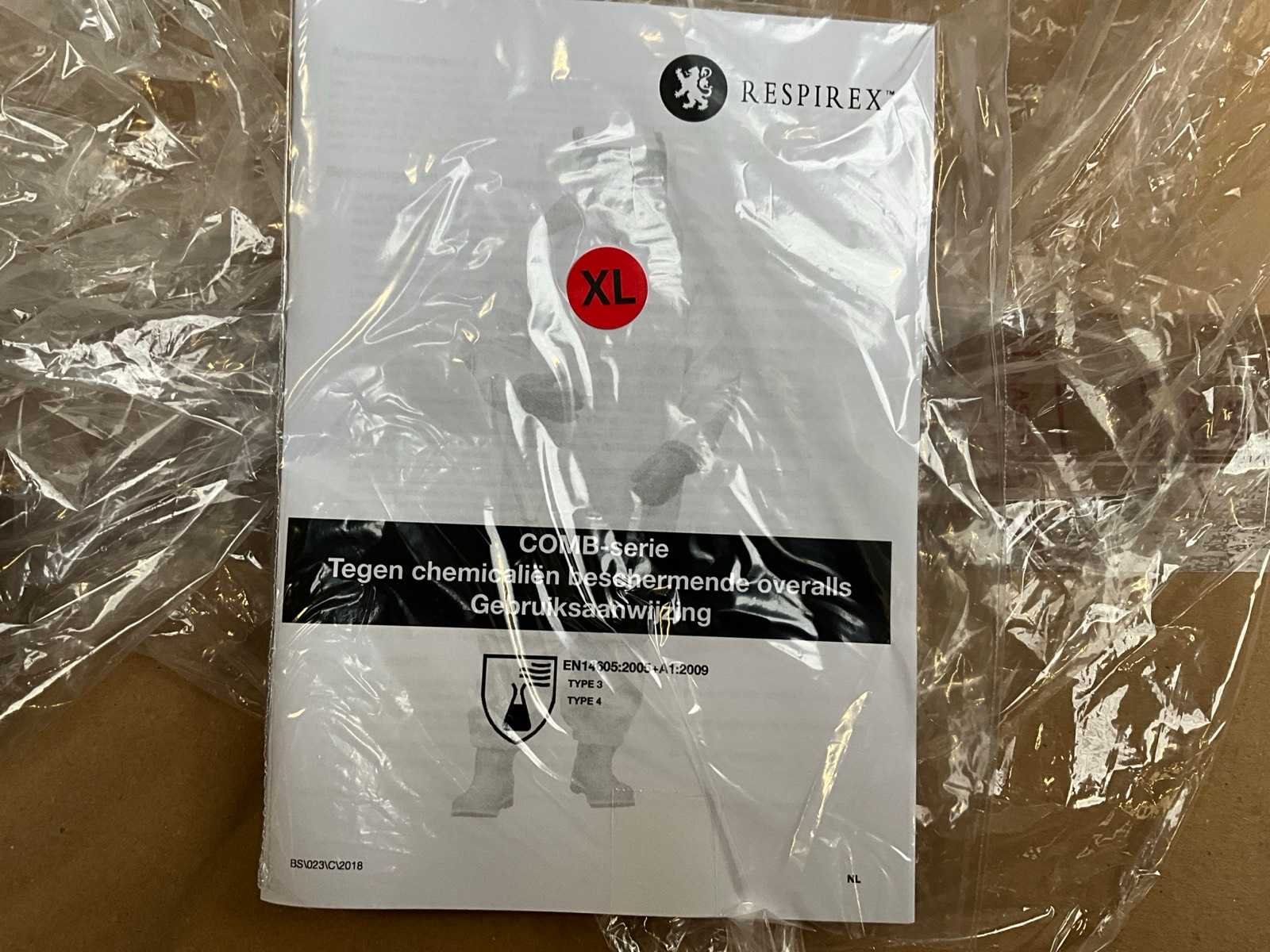 Dit is een gebruiksaanwijzing voor chemisch bestendige overalls van het merk Respirex. Het betreft de COMB-serie in maat XL. De kleding voldoet aan norm EN 14305:2000+A1:2009. Het gaat om Type 3 (vloeistofdicht) en Type 4 (sproeidicht) bescherming. Niet gecontroleerd op maten en aantallen Merk: Respirex Model: COMB - XL Product type: chemicaliën beschermende Maat: XL